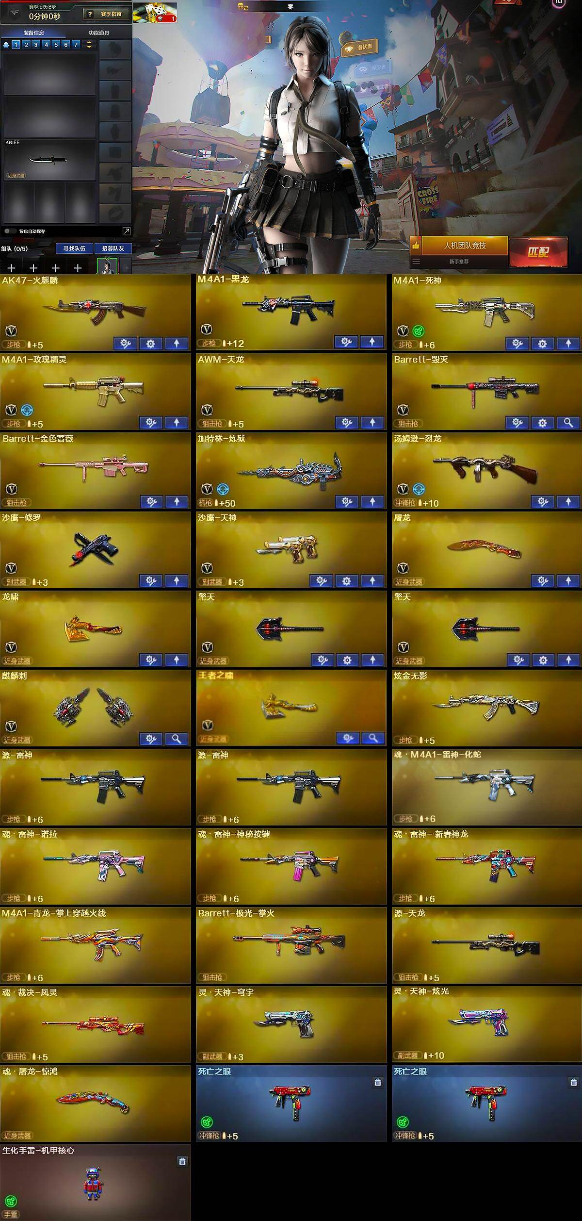 【英雄级武器】:AK47-火麒麟,M4A1-黑龙,M4A1-死神,M4A1-玫瑰精灵,AWM-天龙,Barrett-毁灭,Barrett-金色蔷薇,加特林-炼狱,汤姆逊-烈龙,沙鹰-修罗,沙鹰-天神,屠龙,龙啸,擎天*2,麒麟刺,王者之啸-觉醒版