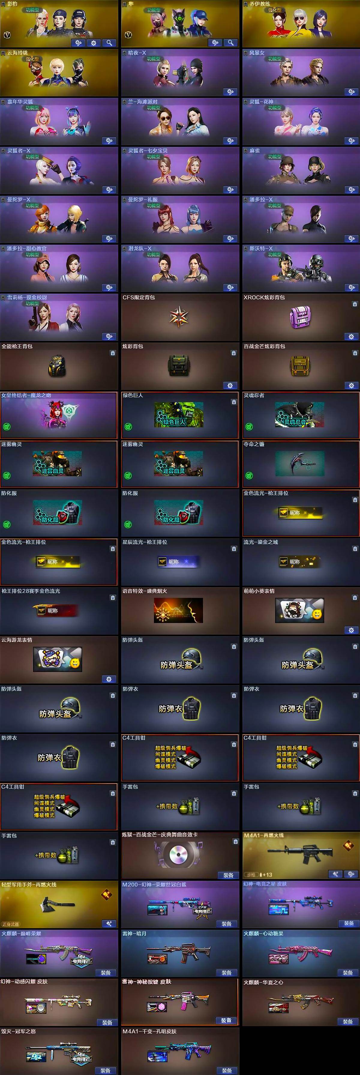 【道具】:CFS限定背包,XROCK炫彩背包,全能枪王背包,炫彩背包,百战金芒炫彩背包,女皇终结者-魔龙之吻,绿色巨人,灵魂忍者,迷雾幽灵*2,夺命之镰,防化服*2,金色流光-枪王排位*2,星辰流光-枪王排位,流光-鎏金之域,枪王排位28赛季金色流光,语音特效-盛典烟火,萌萌小葵表情,云海游龙表情,防弹头盔*3,防弹衣*3,C4工具钳*3,手雷包*3