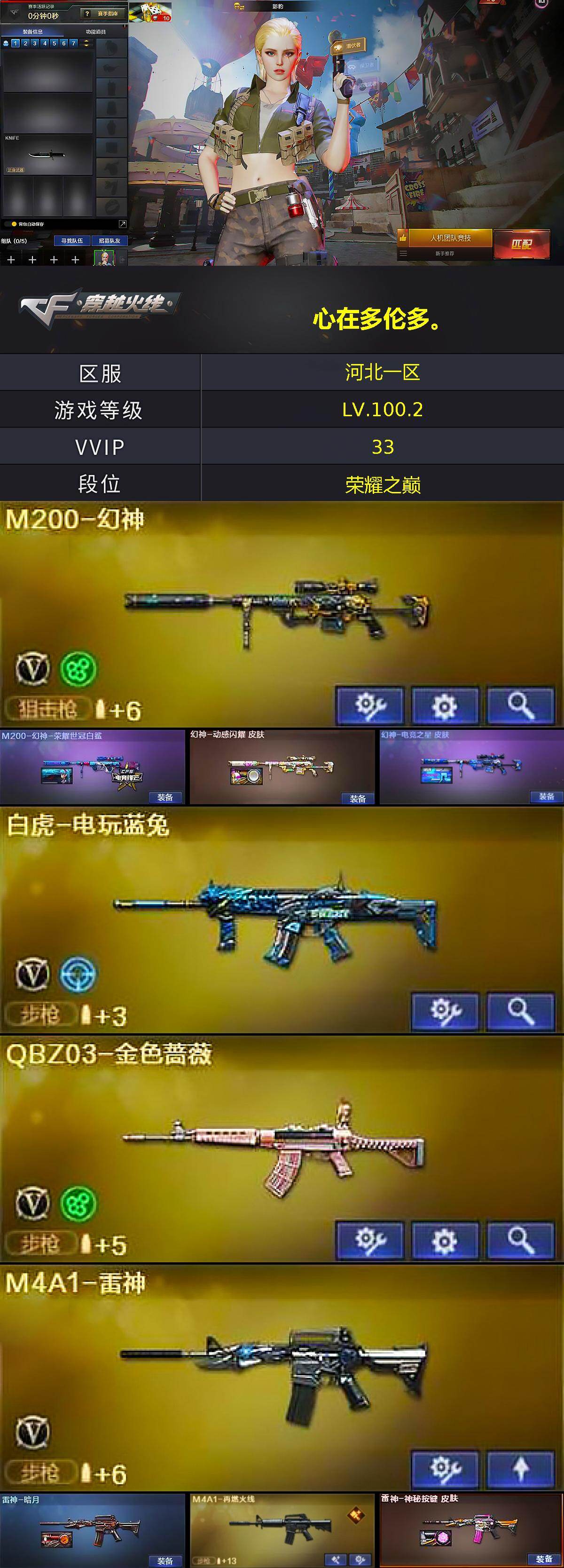 [16942091]河北一区-35V-1王者武器数-0炫金武器数 【热门武器】:QBZ03-金色蔷薇,M4A1-青龙,M200-幻神,白虎-电玩蓝兔,COP-白鲨 【音效卡】:炼狱-百战金芒-庆典舞曲音效卡 【皮肤】:M200-幻神-荣耀世冠白鲨,幻神-动感闪耀 皮肤,幻神-电竞之星 皮肤,雷神-暗月,M4A1-再燃火线,雷神-神秘按键 皮肤,火麒麟-华夏之心,火麒麟-巅峰荣耀,火麒麟-心动糖果,毁灭-冠军之怒,M4A1-千变-孔明皮肤,轻型军用手斧-再燃火线 【角色】:影豹,隼,乔伊教练,云海玲珑,暗夜-X,风暴女,嘉年华灵狐,兰-海滩派对,灵狐-花神,灵狐者-X,灵狐者-七夕宝贝,麻雀,曼陀罗-X,曼陀罗-礼服,潘多拉-X,潘多拉-甜心教官,潜龙队-X,斯沃特-X,兔囡囡,雪莉杨-摸金校尉 【人偶武器】:COP-白鲨,AWM-灵狐-15周年嘉年华,迷你牛魔王,迷你波特博士,夺魂,迷你牛牛,生化手雷-机甲核心,深渊终结者手雷*2 【暴走生化】:超级对讲机 【挑战大师】:激光毁灭者III-白马银枪*3,神圣爆裂者-末日III 【英雄级武器】:AK47-火麒麟*2,M4A1-雷神,M4A1-青龙,无影-神兵利器,M4A1-玫瑰精灵,QBZ03-金色蔷薇,王者之武-觉醒版,白虎-电玩蓝兔,Barrett-毁灭,M200-幻神,炼狱-百战金芒,天神-动感闪耀,擎天-云海游龙,麒麟刺-百战金芒,高爆手雷-幻灵*2,手雷-动感闪耀,手雷-云海游龙,闪光弹-幻灵*2,烟雾弹-幻灵*2,M4A1-苍鸣雷神 【道具】:CFS限定背包,XROCK炫彩背包,全能枪王背包,炫彩背包,百战金芒炫彩背包,女皇终结者-魔龙之吻,绿色巨人,灵魂忍者,迷雾幽灵*2,夺命之镰,防化服*2,金色流光-枪王排位*2,星辰流光-枪王排位,流光-鎏金之域,枪王排位28赛季金色流光,语音特效-盛典烟火,萌萌小葵表情,云海游龙表情,防弹头盔*3,防弹衣*3,C4工具钳*3,手雷包*3 【特殊枪械】: