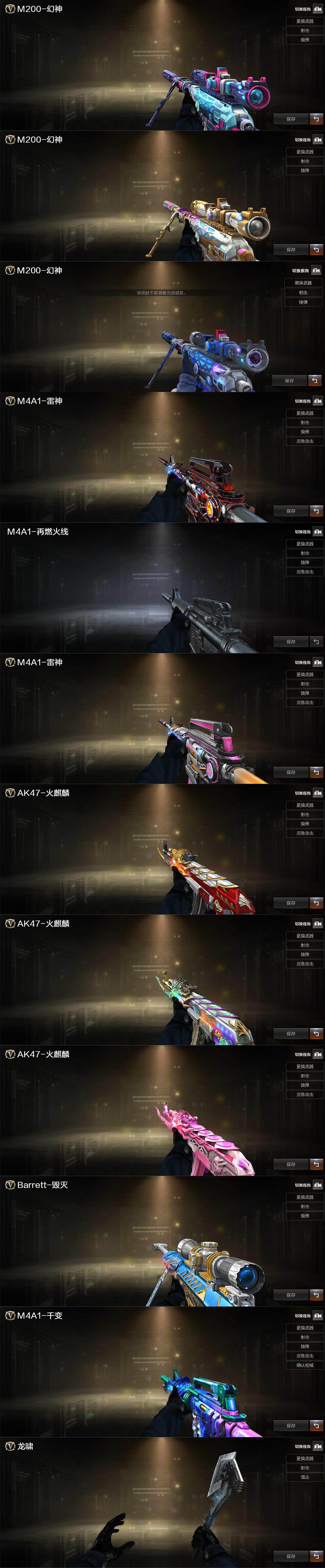 【皮肤】:M200-幻神-荣耀世冠白鲨,幻神-动感闪耀 皮肤,幻神-电竞之星 皮肤,雷神-暗月,M4A1-再燃火线,雷神-神秘按键 皮肤,火麒麟-华夏之心,火麒麟-巅峰荣耀,火麒麟-心动糖果,毁灭-冠军之怒,M4A1-千变-孔明皮肤,轻型军用手斧-再燃火线
