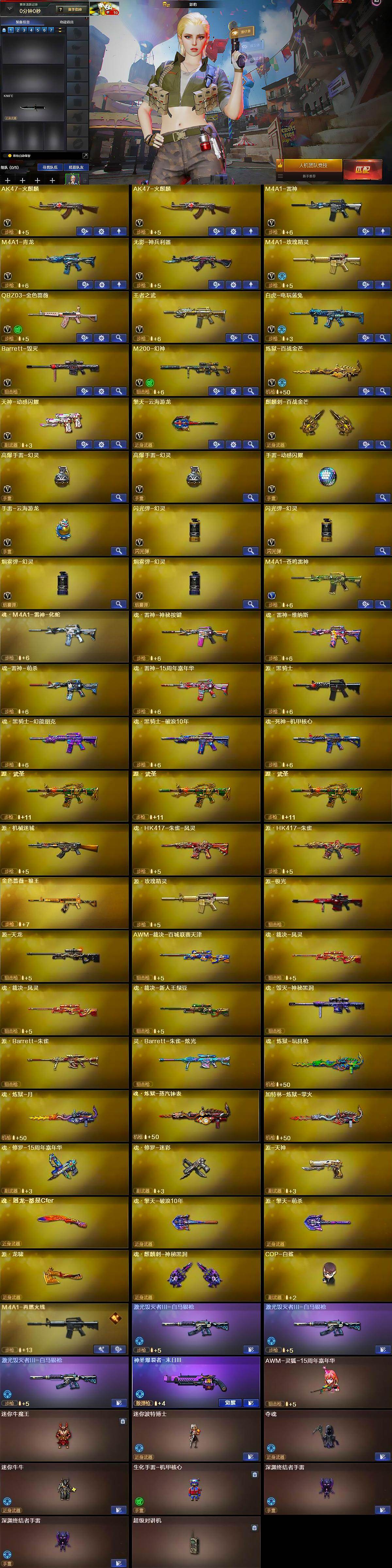 【英雄级武器】:AK47-火麒麟*2,M4A1-雷神,M4A1-青龙,无影-神兵利器,M4A1-玫瑰精灵,QBZ03-金色蔷薇,王者之武-觉醒版,白虎-电玩蓝兔,Barrett-毁灭,M200-幻神,炼狱-百战金芒,天神-动感闪耀,擎天-云海游龙,麒麟刺-百战金芒,高爆手雷-幻灵*2,手雷-动感闪耀,手雷-云海游龙,闪光弹-幻灵*2,烟雾弹-幻灵*2,M4A1-苍鸣雷神
