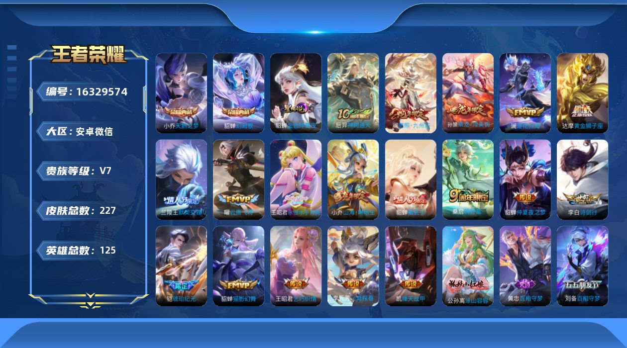 [16329574]安卓WX-V7-最强王者段位-125英雄-227皮肤-2典藏皮肤-18传说-75史诗-1星传说