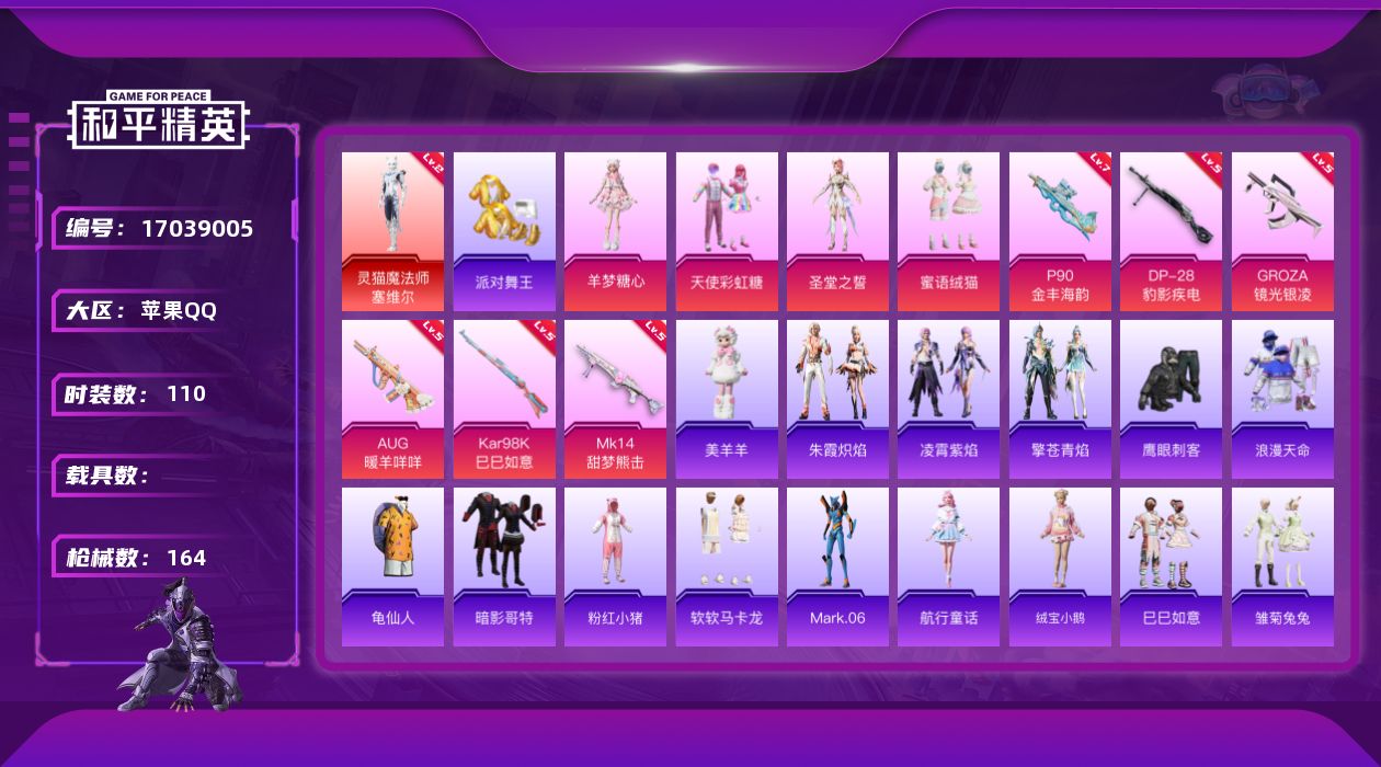 [17039005]苹果 手Q-1神装-4粉装-6特效枪-0载具-0粉色飞行器-47121热力值-9王牌印记-110套装-164枪皮