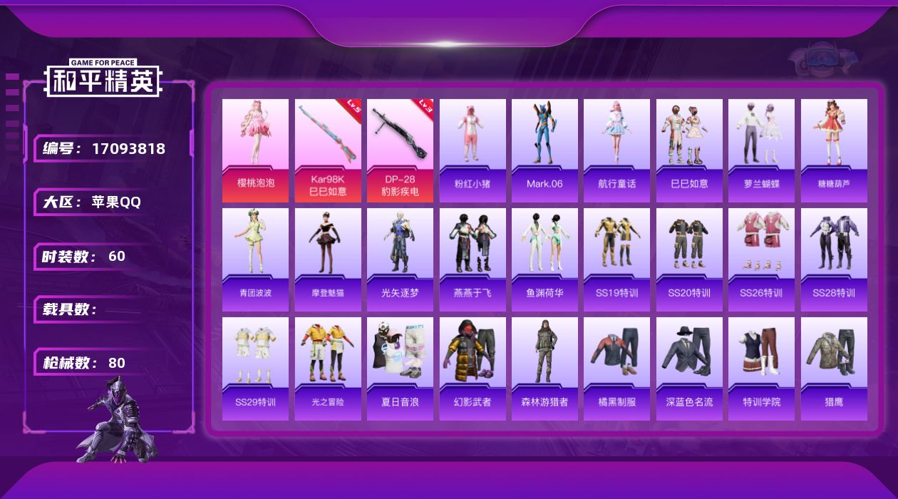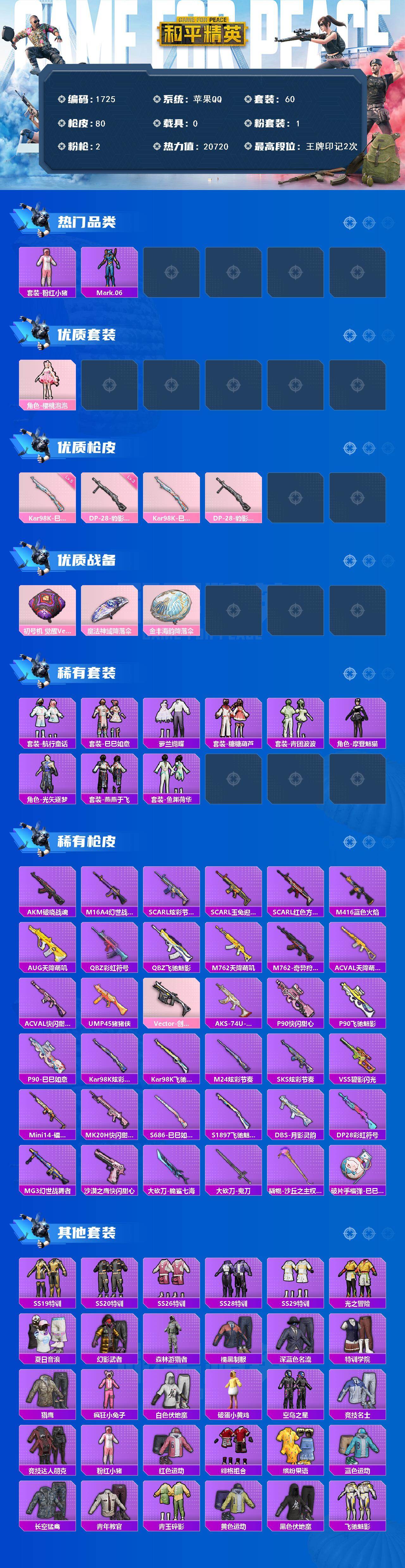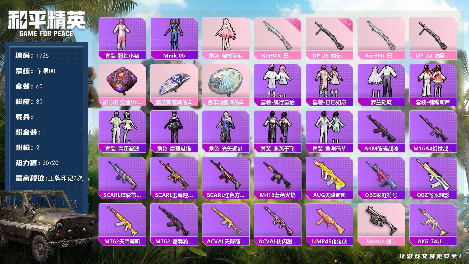 [17093818]【1725】苹果 手Q-1粉装-2特效枪-0载具-0粉色飞行器-20720热力值-2王牌印记-60套装-80枪皮