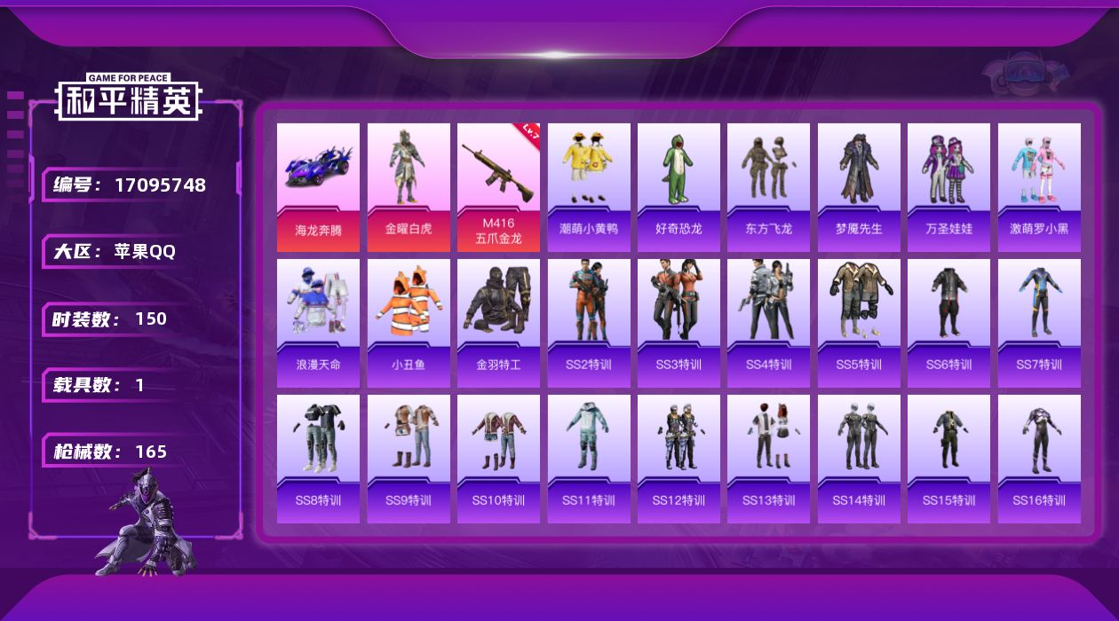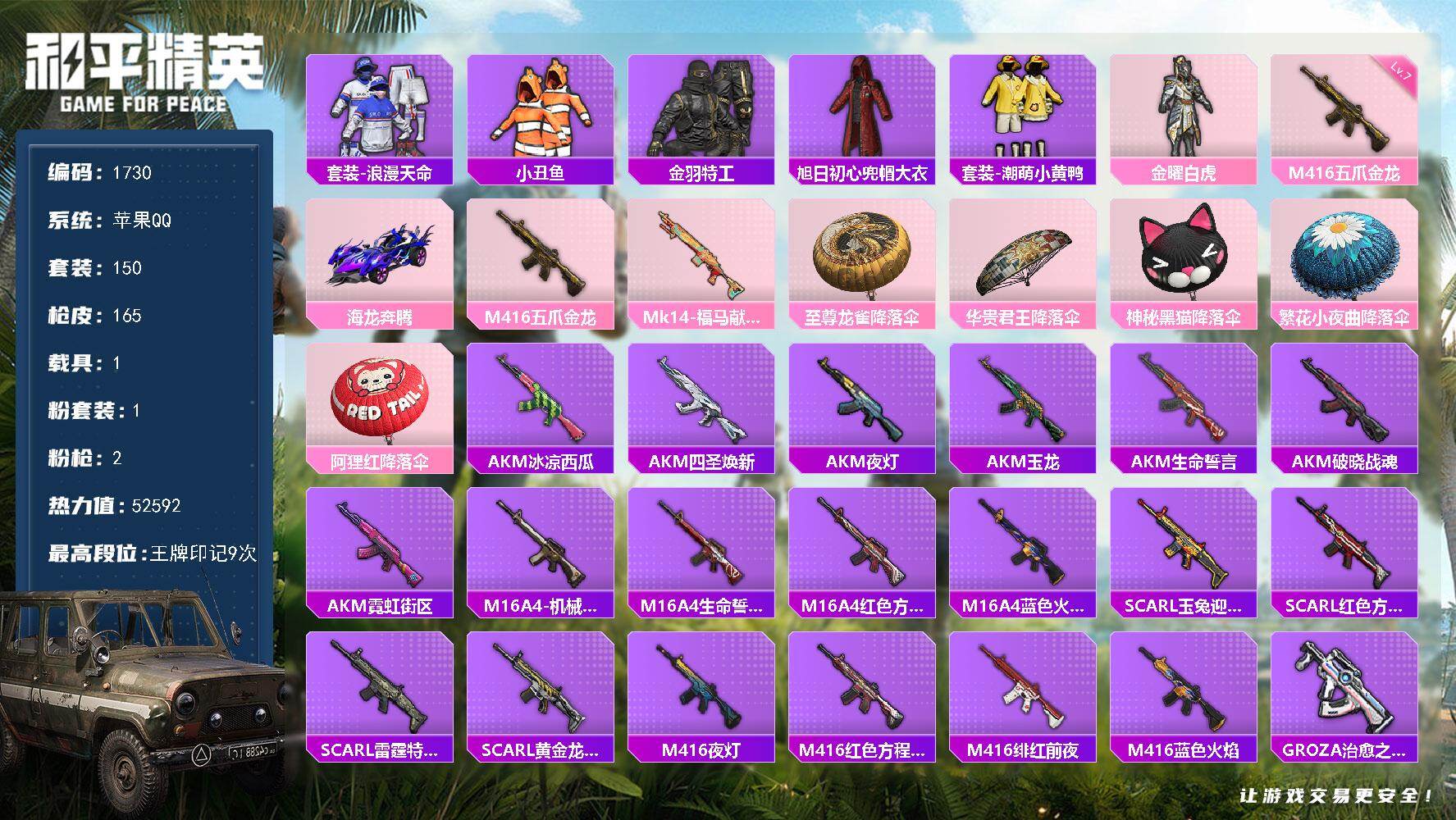 [17095748]【1730】苹果 手Q-1粉装-2特效枪-1载具-0粉色飞行器-52592热力值-9王牌印记-150套装-165枪皮