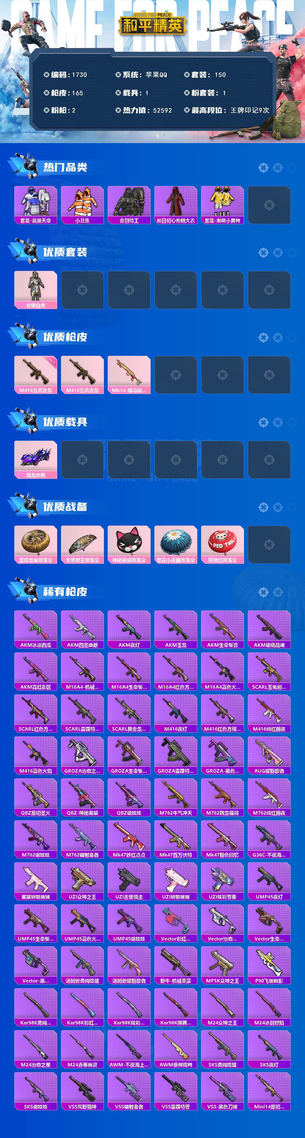 [17095748]【1730】苹果 手Q-1粉装-2特效枪-1载具-0粉色飞行器-52592热力值-9王牌印记-150套装-165枪皮 【热门品类】:套装-浪漫天命,套装-小丑鱼,套装-金羽特工,旭日初心兜帽大衣,套装-潮萌小黄鸭 【粉色套装】:粉装-金曜白虎 【粉色枪皮等级】:M416-五爪金龙(七级) 【粉色载具】:海龙奔腾 【粉色枪皮】:M416-五爪金龙,Mk14-福马献瑞 【粉色降落伞】:至尊龙雀降落伞,华贵君王降落伞,神秘黑猫降落伞,繁花小夜曲降落伞,阿狸红降落伞 【稀有枪皮】:AKM-冰凉西瓜,AKM-四圣焕新,AKM-夜灯,AKM-玉龙,AKM-生命誓言,AKM-破晓战魂,AKM-霓虹街区,M16A4-机械英豪,M16A4-生命誓言,M16A4-红色方程式,M16A4-蓝色火焰,SCAR-L-玉兔迎春,SCAR-L-红色方程式,SCAR-L-雷霆特警,SCAR-L-黄金龙骨,M416-夜灯,M416-红色方程式,M416-绯红前夜,M416-蓝色火焰,GROZA-治愈之星,GROZA-生命誓言,GROZA-雷霆特警,GROZA-黑色刀锋,AUG-耀粉歌者,QBZ-原初圣火,QBZ-神秘黑猫,QBZ-诡娃娃,M762-牛气冲天,M762-瑞龙福将,M762-绯红前夜,M762-诡娃娃,M762-镭射皇者,Mk47-妙红点点,Mk47-百万伏特,Mk47-粉色回忆,G36C-不夜海上花,蜜獾-娇憨猪猪,UZI-众神之王,UZI-古堡领主,UZI-娇憨猪猪,UZI-炫彩节奏,UMP45-夜灯,UMP45-生命誓言,UMP45-蓝色火焰,UMP45-诡娃娃,Vector-彩虹符号,Vector-治愈之星,Vector-生命誓言,Vector-黑色刀锋,汤姆逊-勇闯险境,汤姆逊-耀粉歌者,野牛-机械英豪,MP5K-众神之王,P90-飞驰魅影,Kar98K-勇闯险境,Kar98K-彩虹符号,Kar98K-炫彩节奏,Kar98K-狮舞迎春,M24-治愈之星,M24-赤寒幽灵,M24-众神之王,M24-冰封烈焰,AWM-不夜海上花,AWM-垂柳戏鸭,SKS-勇闯险境,SKS-夜灯,SKS-诡娃娃,VSS-荒野猎神,VSS-镭射皇者,VSS-雷霆特警,VSS-黑色刀锋,Mini14-原初圣火,Mini14-炫彩节奏,Mini14-生命誓言,Mini14-金鼠迎春,Mk14-治愈之星,