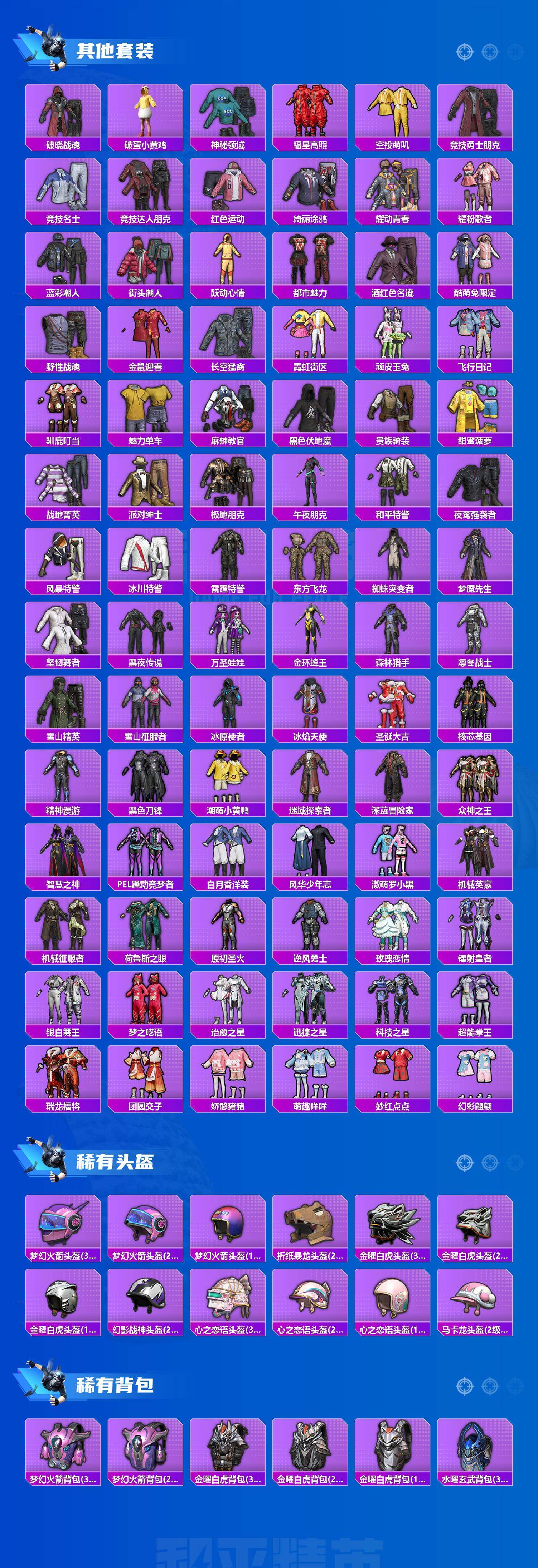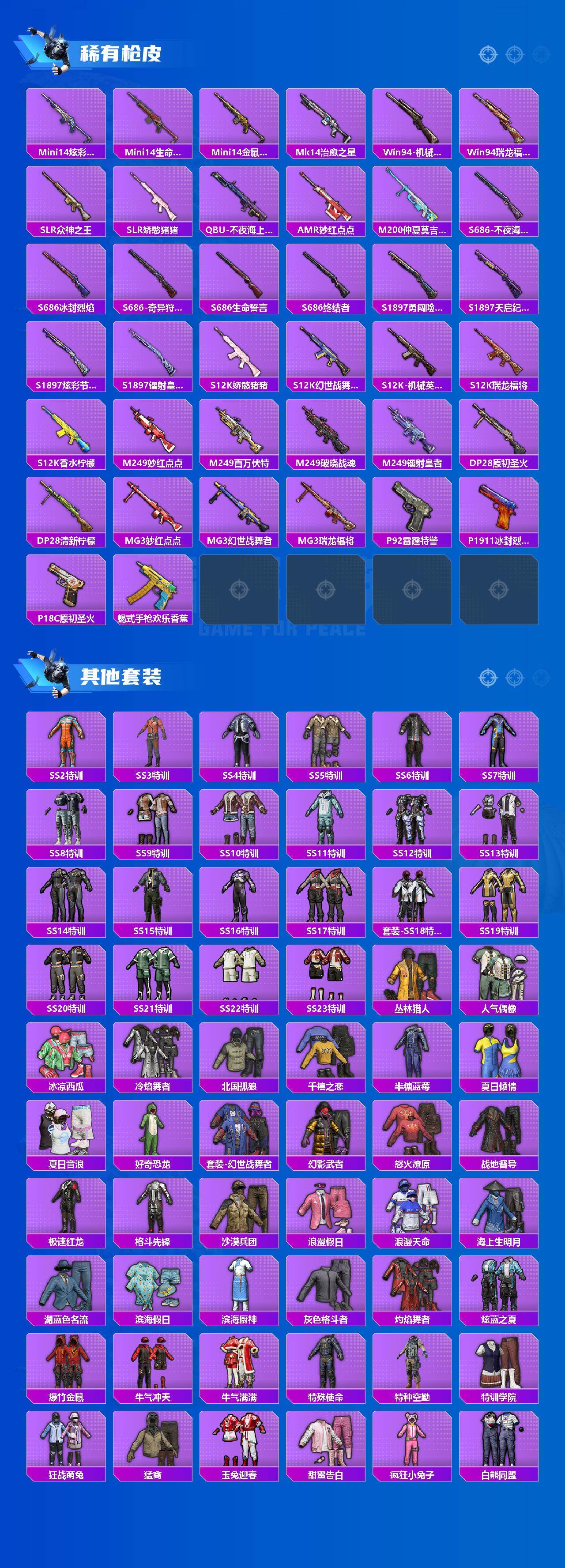 【稀有枪皮】:AKM-冰凉西瓜,AKM-四圣焕新,AKM-夜灯,AKM-玉龙,AKM-生命誓言,AKM-破晓战魂,AKM-霓虹街区,M16A4-机械英豪,M16A4-生命誓言,M16A4-红色方程式,M16A4-蓝色火焰,SCAR-L-玉兔迎春,SCAR-L-红色方程式,SCAR-L-雷霆特警,SCAR-L-黄金龙骨,M416-夜灯,M416-红色方程式,M416-绯红前夜,M416-蓝色火焰,GROZA-治愈之星,GROZA-生命誓言,GROZA-雷霆特警,GROZA-黑色刀锋,AUG-耀粉歌者,QBZ-原初圣火,QBZ-神秘黑猫,QBZ-诡娃娃,M762-牛气冲天,M762-瑞龙福将,M762-绯红前夜,M762-诡娃娃,M762-镭射皇者,Mk47-妙红点点,Mk47-百万伏特,Mk47-粉色回忆,G36C-不夜海上花,蜜獾-娇憨猪猪,UZI-众神之王,UZI-古堡领主,UZI-娇憨猪猪,UZI-炫彩节奏,UMP45-夜灯,UMP45-生命誓言,UMP45-蓝色火焰,UMP45-诡娃娃,Vector-彩虹符号,Vector-治愈之星,Vector-生命誓言,Vector-黑色刀锋,汤姆逊-勇闯险境,汤姆逊-耀粉歌者,野牛-机械英豪,MP5K-众神之王,P90-飞驰魅影,Kar98K-勇闯险境,Kar98K-彩虹符号,Kar98K-炫彩节奏,Kar98K-狮舞迎春,M24-治愈之星,M24-赤寒幽灵,M24-众神之王,M24-冰封烈焰,AWM-不夜海上花,AWM-垂柳戏鸭,SKS-勇闯险境,SKS-夜灯,SKS-诡娃娃,VSS-荒野猎神,VSS-镭射皇者,VSS-雷霆特警,VSS-黑色刀锋,Mini14-原初圣火,Mini14-炫彩节奏,Mini14-生命誓言,Mini14-金鼠迎春,Mk14-治愈之星,