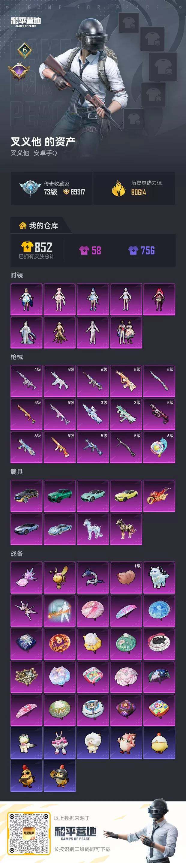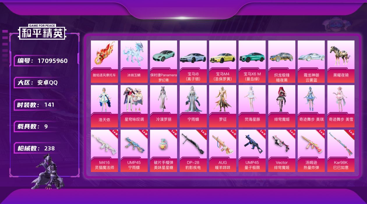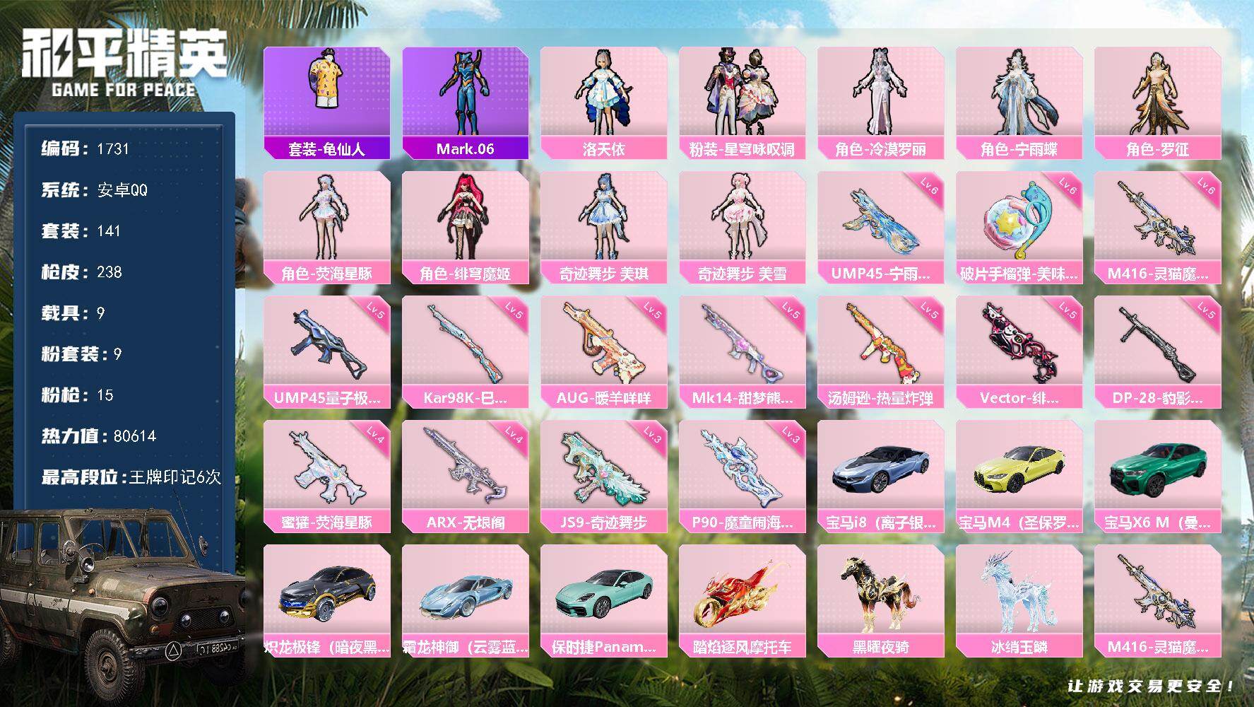 [17095960]【1731】安卓 手Q-9粉装-15特效枪-9载具-6粉色飞行器-80614热力值-6王牌印记-141套装-238枪皮