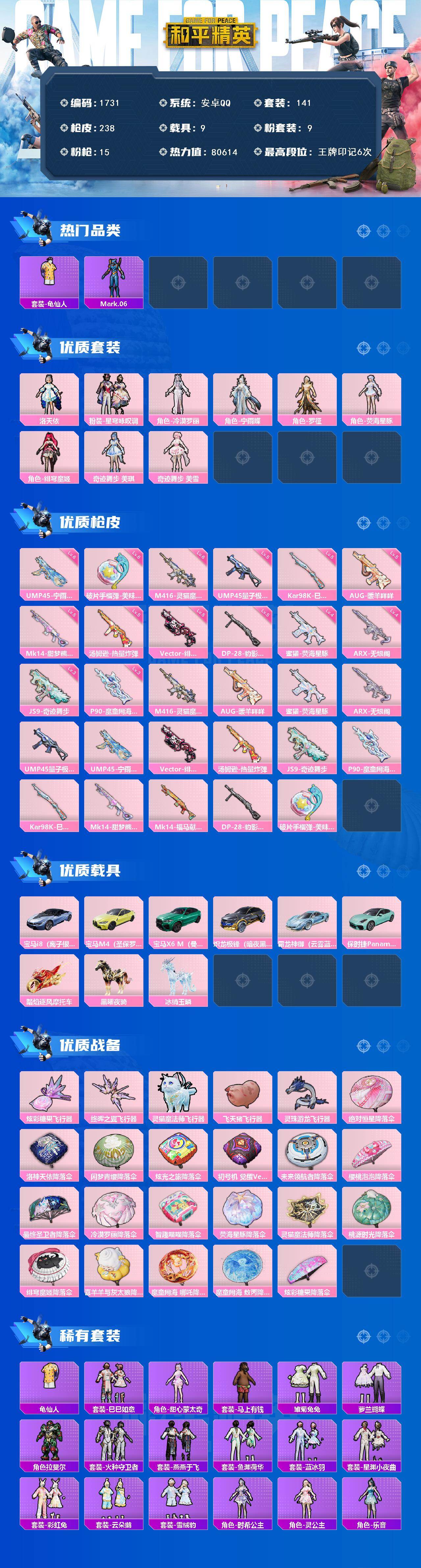 [17095960]【1731】安卓 手Q-9粉装-15特效枪-9载具-6粉色飞行器-80614热力值-6王牌印记-141套装-238枪皮 【热门品类】:套装-龟仙人,角色-Mark.06 【粉色套装】:角色-洛天依,粉装-星穹咏叹调,角色-冷漠罗丽,角色-宁雨蝶,角色-罗征,角色-荧海星豚,角色-绯穹魔姬,角色-奇迹舞步 美琪,角色-奇迹舞步 美雪 【粉色枪皮等级】:M416-灵猫魔法师(六级),AUG-暖羊咩咩(五级),蜜獾-荧海星豚(四级),ARX-无垠阁(四级),UMP45-量子极限(五级),UMP45-宁雨蝶(六级),Vector-绯穹魔姬(五级),汤姆逊-热量炸弹(五级),JS9-奇迹舞步(三级),P90-魔童闹海 敖丙(三级),Kar98K-巳巳如意(五级),Mk14-甜梦熊击(五级),DP-28-豹影疾电(五级),破片手榴弹-美味星星糖(六级) 【粉色载具】:宝马i8(离子银),宝马M4(圣保罗黄),宝马X6 M(曼岛绿),炽龙极锋(暗夜黑),霜龙神御(云雾蓝),保时捷Panamera(梦幻青),踏焰逐风摩托车,黑曜夜骑,冰绡玉鳞 【粉色枪皮】:M416-灵猫魔法师,AUG-暖羊咩咩,蜜獾-荧海星豚,ARX-无垠阁,UMP45-量子极限,UMP45-宁雨蝶,Vector-绯穹魔姬,汤姆逊-热量炸弹,JS9-奇迹舞步,P90-魔童闹海 敖丙,Kar98K-巳巳如意,Mk14-甜梦熊击,Mk14-福马献瑞,DP-28-豹影疾电,破片手榴弹-美味星星糖 【粉色飞行器】:炫彩糖果飞行器,终晖之翼飞行器,灵猫魔法师飞行器,飞天猪飞行器,灵珠游龙飞行器 【粉色降落伞】:绝对恒星降落伞,洛神天依降落伞,闲梦青缨降落伞,炫光之旅降落伞,初号机 觉醒Ver.降落伞,未来领航者降落伞,樱桃泡泡降落伞,最终圣卫者降落伞,冷漠罗丽降落伞,智趣喵喵降落伞,荧海星豚降落伞,灵猫魔法师降落伞,桃源时光降落伞,绯穹魔姬降落伞,喜羊羊与灰太狼降落伞,魔童闹海 哪吒降落伞,魔童闹海 敖丙降落伞,炫彩糖果降落伞 【稀有套装】:套装-龟仙人,套装-巳巳如意,角色-甜心蒙太奇,套装-雪国风尚,套装-炫彩糖果,套装-马上有钱,套装-雏菊兔兔,套装-萝兰蝴蝶,角色-拉斐尔,套装-火种守卫者,套装-燕燕于飞,套装-鱼渊荷华,套装-蓝冰羽,套装-星渊小夜曲,套装-彩虹兔,套装-云朵鹅,套装-雪绒豹,角色-时希公主,角