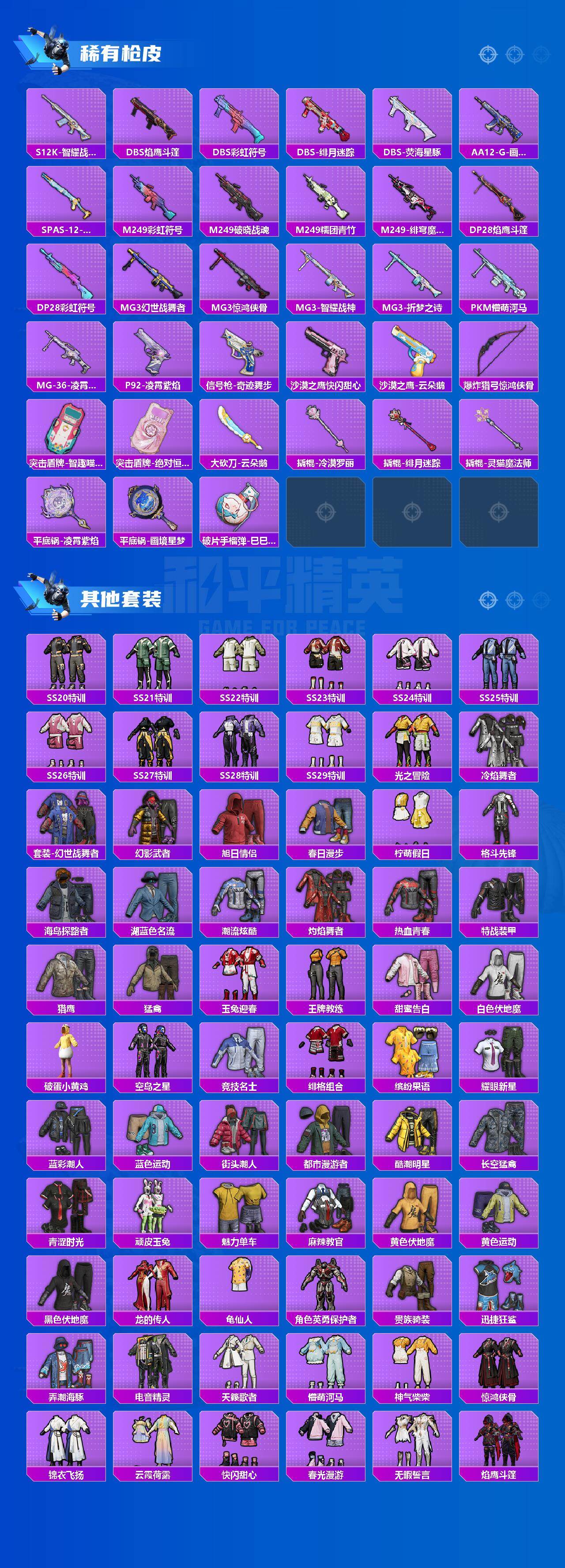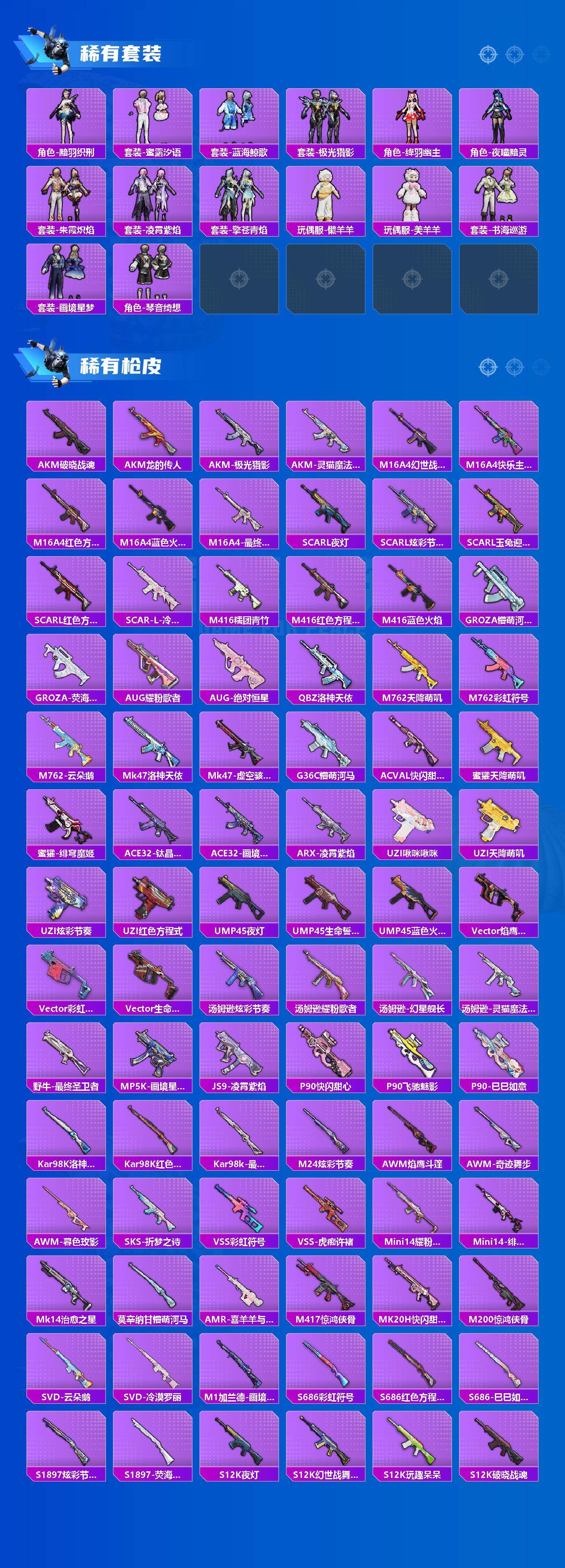 【粉色枪皮等级】:M416-灵猫魔法师(六级),AUG-暖羊咩咩(五级),蜜獾-荧海星豚(四级),ARX-无垠阁(四级),UMP45-量子极限(五级),UMP45-宁雨蝶(六级),Vector-绯穹魔姬(五级),汤姆逊-热量炸弹(五级),JS9-奇迹舞步(三级),P90-魔童闹海 敖丙(三级),Kar98K-巳巳如意(五级),Mk14-甜梦熊击(五级),DP-28-豹影疾电(五级),破片手榴弹-美味星星糖(六级)