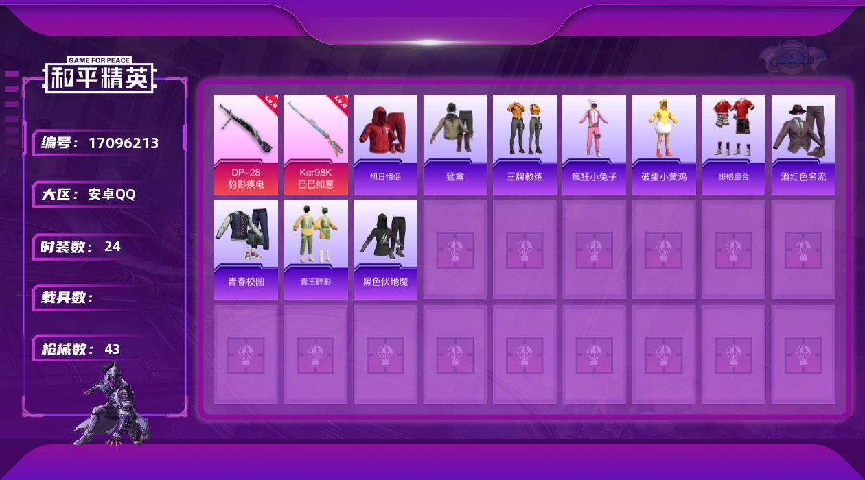 [17096213]【1732】安卓 手Q-0粉装-3特效枪-0载具-0粉色飞行器-9176热力值-1王牌印记-24套装-43枪皮