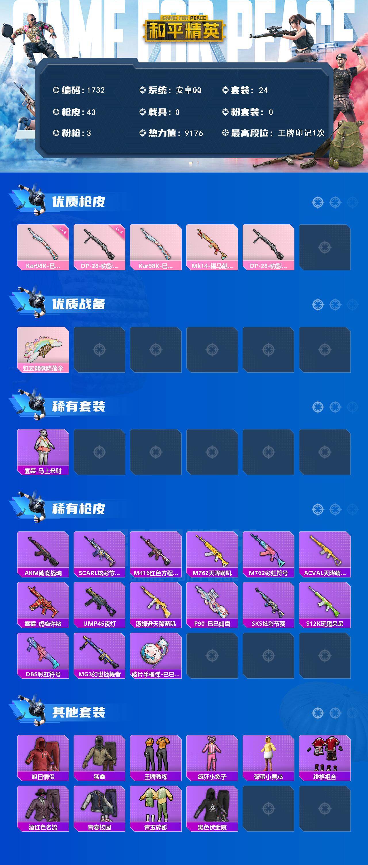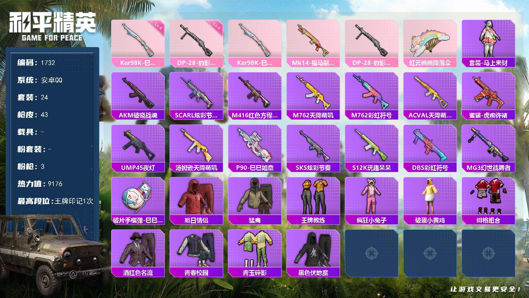 [17096213]【1732】安卓 手Q-0粉装-3特效枪-0载具-0粉色飞行器-9176热力值-1王牌印记-24套装-43枪皮 【粉色枪皮等级】:Kar98K-巳巳如意(四级),DP-28-豹影疾电(四级) 【粉色枪皮】:Kar98K-巳巳如意,Mk14-福马献瑞,DP-28-豹影疾电 【粉色降落伞】:虹云熊熊降落伞 【稀有套装】:套装-雪国风尚,套装-马上来财 【稀有枪皮】:AKM-破晓战魂,SCAR-L-炫彩节奏,M416-红色方程式,M762-天降萌叽,M762-彩虹符号,AC-VAL-天降萌叽,蜜獾-虎痴许褚,UMP45-夜灯,汤姆逊-天降萌叽,P90-巳巳如意,SKS-炫彩节奏,S12K-玩趣呆呆,DBS-彩虹符号,MG3-幻世战舞者,破片手榴弹-巳巳如意 【其他套装】:套装-旭日情侣,套装-猛禽,套装-王牌教练,套装-疯狂小兔子,套装-破蛋小黄鸡,套装-绯格组合,套装-酒红色名流,套装-青春校园,套装-青玉碎影,套装-黑色伏地魔 【营地ID】:966437348