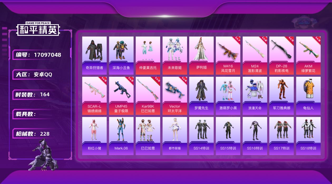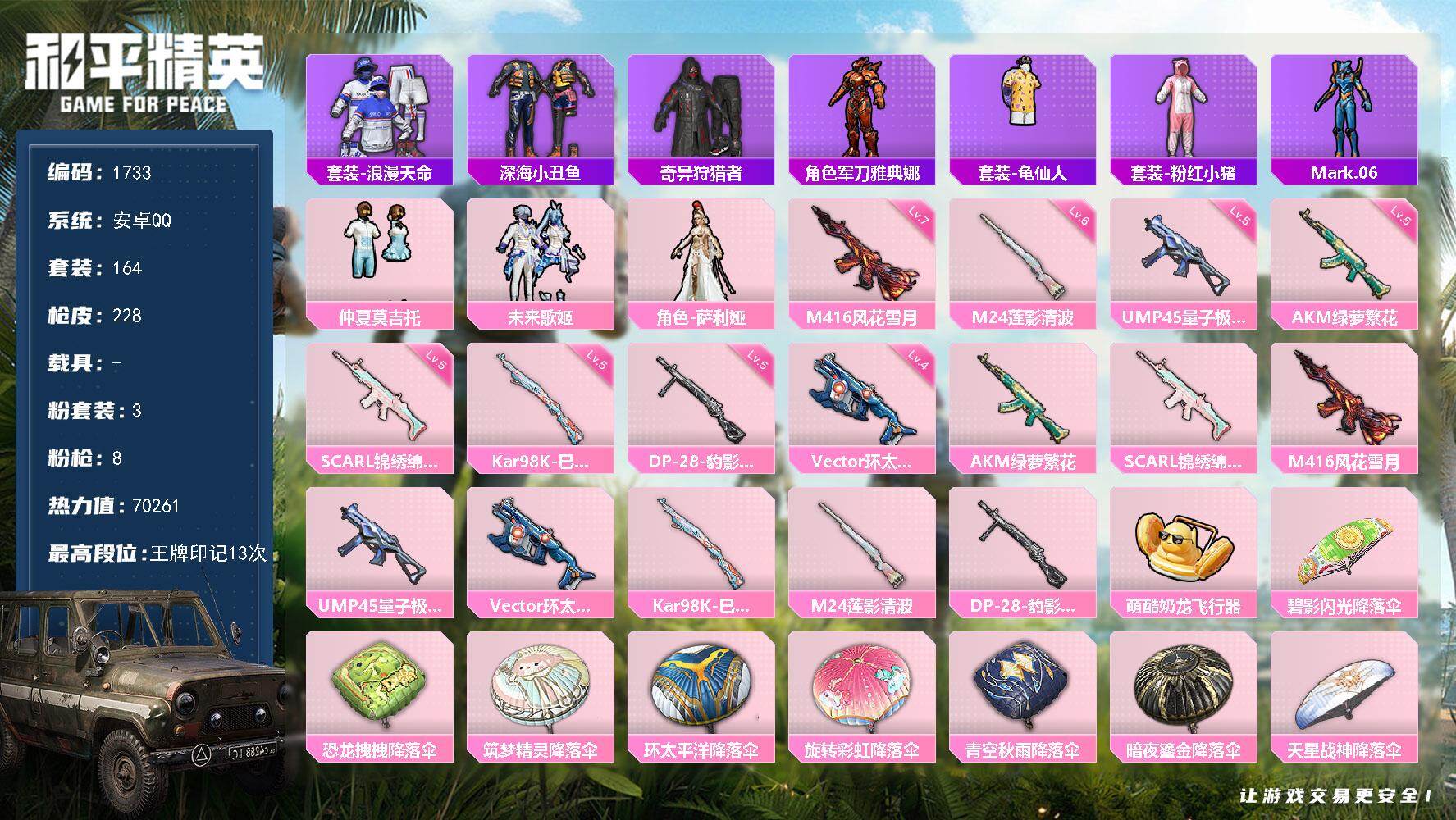 [17097048]【1733】安卓 手Q-3粉装-8特效枪-0载具-2粉色飞行器-70261热力值-13王牌印记-164套装-228枪皮