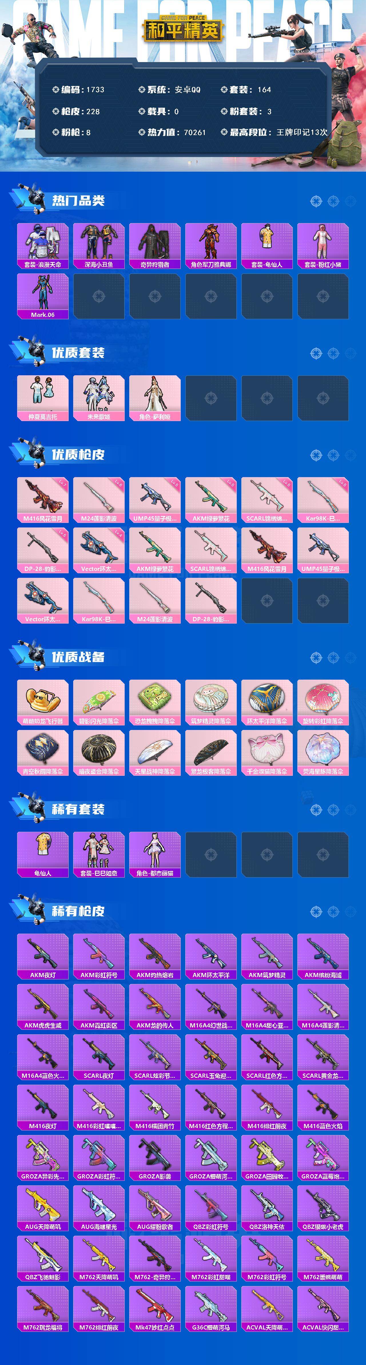 [17097048]【1733】安卓 手Q-3粉装-8特效枪-0载具-2粉色飞行器-70261热力值-13王牌印记-164套装-228枪皮 【热门品类】:套装-浪漫天命,套装-深海小丑鱼,套装-奇异狩猎者,角色-军刀雅典娜,套装-龟仙人,套装-粉红小猪,角色-Mark.06 【粉色套装】:粉装-仲夏莫吉托,粉装-未来歌姬,角色-萨利娅 【粉色枪皮等级】:AKM-绿萝繁花(五级),SCAR-L-锦绣绵绵(五级),M416-风花雪月(七级),UMP45-量子极限(五级),Vector-环太平洋(四级),Kar98K-巳巳如意(五级),M24-莲影清波(六级),DP-28-豹影疾电(五级) 【粉色枪皮】:AKM-绿萝繁花,SCAR-L-锦绣绵绵,M416-风花雪月,UMP45-量子极限,Vector-环太平洋,Kar98K-巳巳如意,M24-莲影清波,DP-28-豹影疾电 【粉色飞行器】:萌酷奶龙飞行器 【粉色降落伞】:碧影闪光降落伞,恐龙拽拽降落伞,筑梦精灵降落伞,环太平洋降落伞,旋转彩虹降落伞,青空秋雨降落伞,暗夜鎏金降落伞,天星战神降落伞,繁龙极客降落伞,千金淑猫降落伞,荧海星豚降落伞 【稀有套装】:套装-龟仙人,套装-巳巳如意,套装-雪国风尚,角色-都市丽猫 【稀有枪皮】:AKM-夜灯,AKM-彩虹符号,AKM-灼热熔岩,AKM-环太平洋,AKM-筑梦精灵,AKM-缤纷海域,AKM-虎虎生威,AKM-霓虹街区,AKM-龙的传人,M16A4-幻世战舞者,M16A4-甜心亚梦,M16A4-莲影清波,M16A4-蓝色火焰,SCAR-L-夜灯,SCAR-L-炫彩节奏,SCAR-L-玉兔迎春,SCAR-L-红色方程式,SCAR-L-黄金龙骨,M416-夜灯,M416-彩虹嘻嘻猴,M416-糯团青竹,M416-红色方程式,M416-绯红前夜,M416-蓝色火焰,GROZA-异彩先驱,GROZA-彩虹符号,GROZA-影袭,GROZA-懵萌河马,GROZA-田园牧歌,GROZA-蓝莓炮弹,AUG-天降萌叽,AUG-海螺星光,AUG-耀粉歌者,QBZ-彩虹符号,QBZ-洛神天依,QBZ-银碳小老虎,QBZ-飞驰魅影,M762-天降萌叽,M762-奇异狩猎者,M762-彩虹甜喵,M762-彩虹符号,M762-暖熊萌萌,M762-瑞龙福将,M762-绯红前夜,Mk47-妙红点点,G36C-懵萌河马,A