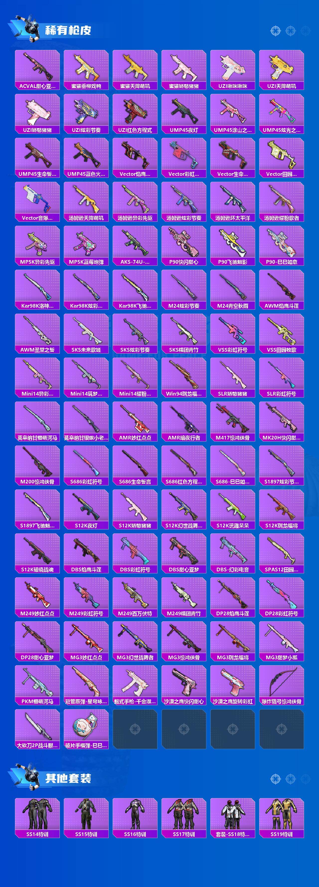 【稀有枪皮】:AKM-夜灯,AKM-彩虹符号,AKM-灼热熔岩,AKM-环太平洋,AKM-筑梦精灵,AKM-缤纷海域,AKM-虎虎生威,AKM-霓虹街区,AKM-龙的传人,M16A4-幻世战舞者,M16A4-甜心亚梦,M16A4-莲影清波,M16A4-蓝色火焰,SCAR-L-夜灯,SCAR-L-炫彩节奏,SCAR-L-玉兔迎春,SCAR-L-红色方程式,SCAR-L-黄金龙骨,M416-夜灯,M416-彩虹嘻嘻猴,M416-糯团青竹,M416-红色方程式,M416-绯红前夜,M416-蓝色火焰,GROZA-异彩先驱,GROZA-彩虹符号,GROZA-影袭,GROZA-懵萌河马,GROZA-田园牧歌,GROZA-蓝莓炮弹,AUG-天降萌叽,AUG-海螺星光,AUG-耀粉歌者,QBZ-彩虹符号,QBZ-洛神天依,QBZ-银碳小老虎,QBZ-飞驰魅影,M762-天降萌叽,M762-奇异狩猎者,M762-彩虹甜喵,M762-彩虹符号,M762-暖熊萌萌,M762-瑞龙福将,M762-绯红前夜,Mk47-妙红点点,G36C-懵萌河马,A