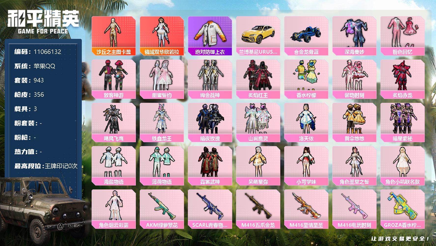 - [15208094]【店主推荐捡漏号!可直接换绑】/素材身法号 苹果 手Q-7粉装-4特效枪-1载具-2粉色飞行器-5.8w热力值-11王牌印记-135套装-196枪皮【热门品类】:粉装-梦幻火箭,套装-深海小丑鱼,套装-奇异狩猎者,套装-龟仙人,套装-暗影哥特,套装-粉红小猪【粉色载具】:玛莎拉蒂Quattroporte(夜幕蓝)【粉色套装】:粉装-梦幻火箭,粉装-冰霜白皇,粉装-炙焰红王,角色-复仇流浪者,粉装-彩虹甜喵,角色-歌者泠鸢,角色-圣堂之誓【粉色枪皮等级】:AKM-绿萝繁花(五级),SCAR-L-青春物语(七级),Kar98K-巳巳如意(五级),DP-28-豹影疾电(五级)【粉色飞行器】:绒雪飘舞飞行器,繁龙极客飞行器
