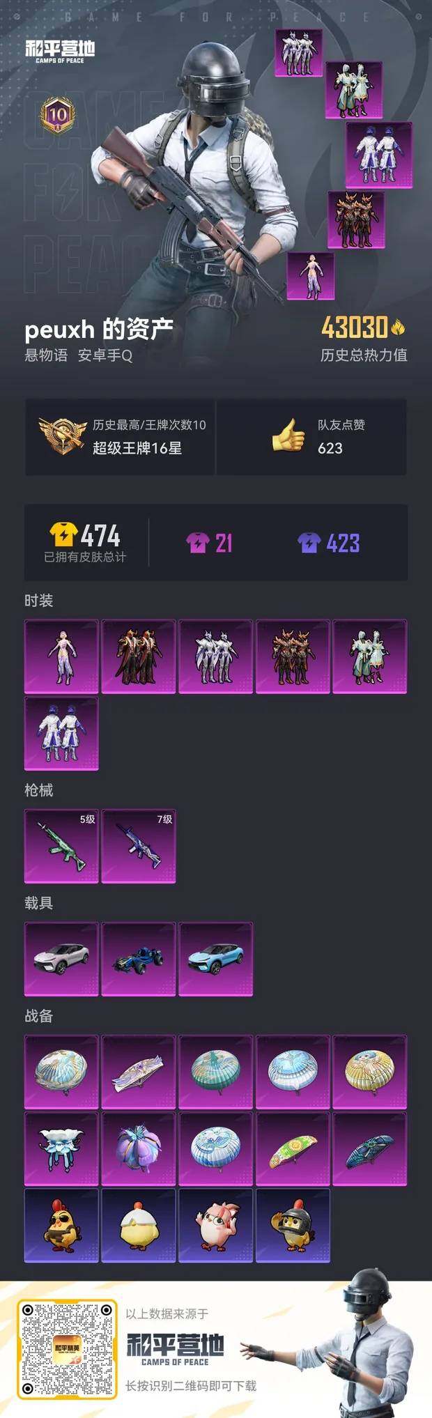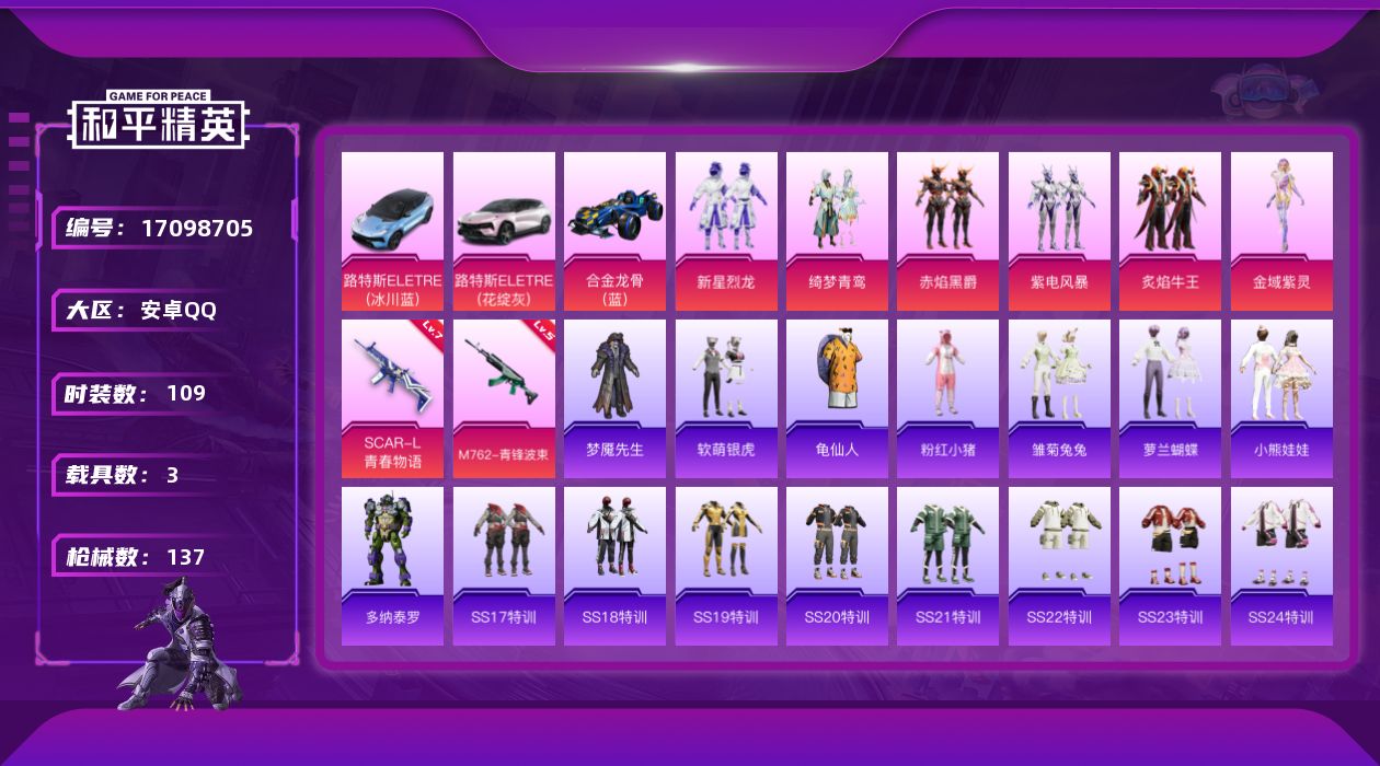 [17098705]【1118】安卓 手Q-6粉装-2特效枪-3载具-1粉色飞行器-43030热力值-10王牌印记-109套装-137枪皮