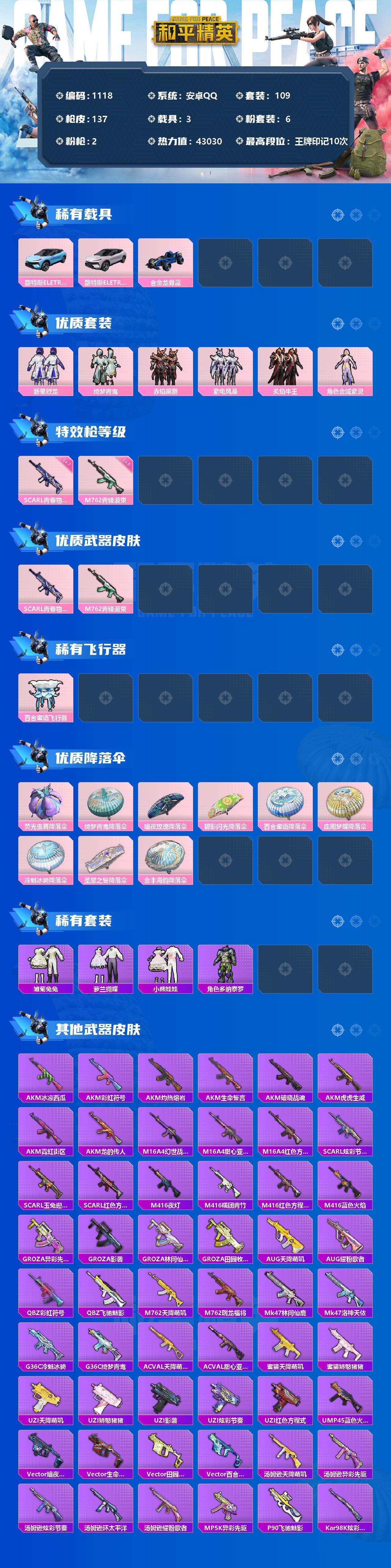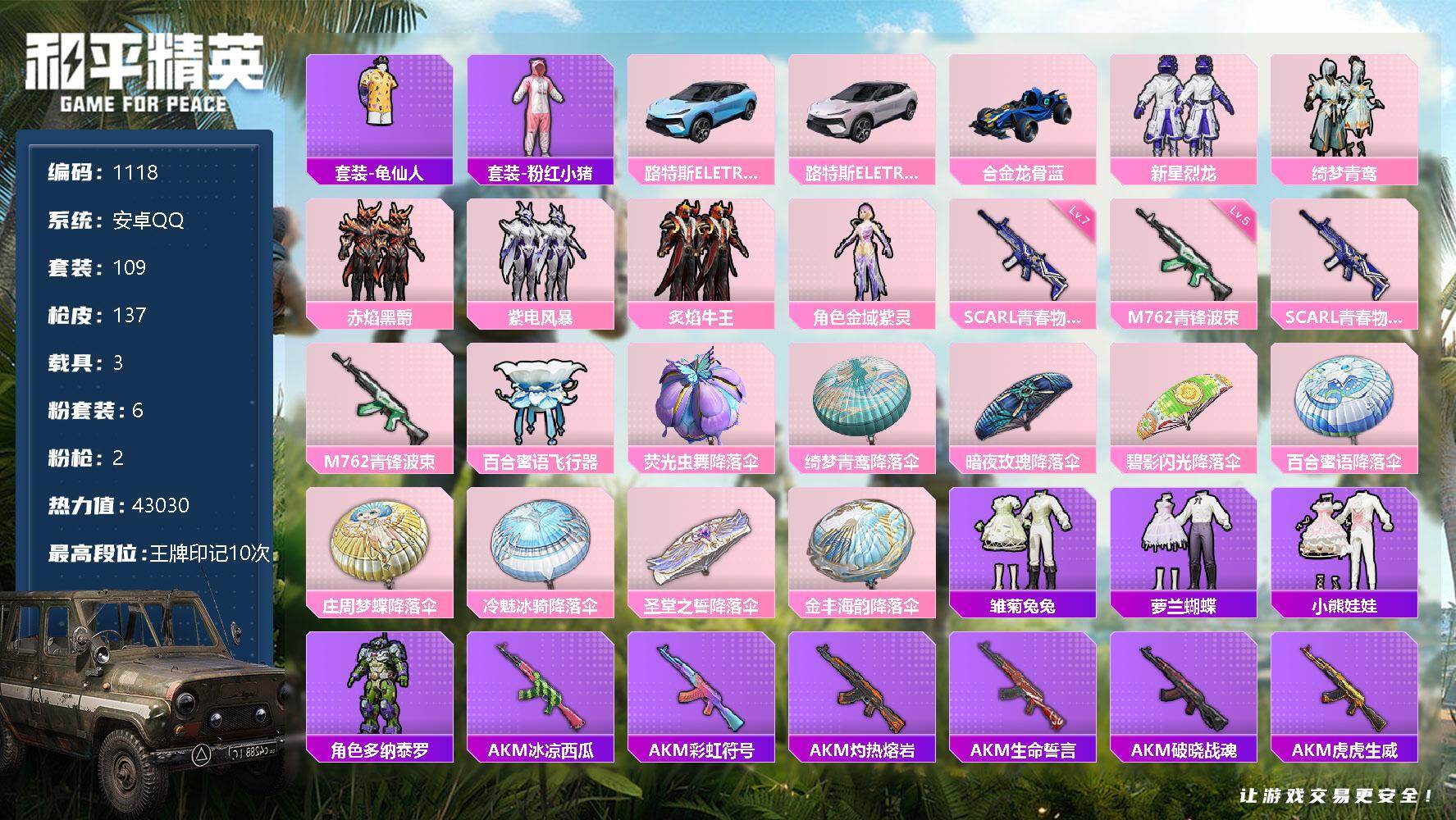 [17098705]【1118】安卓 手Q-6粉装-2特效枪-3载具-1粉色飞行器-43030热力值-10王牌印记-109套装-137枪皮 【热门品类】:套装-龟仙人,套装-粉红小猪 【粉色载具】:路特斯ELETRE(冰川蓝),路特斯ELETRE(花绽灰),合金龙骨(蓝) 【粉色套装】:粉装-新星烈龙,粉装-绮梦青鸾,粉装-赤焰黑爵,粉装-紫电风暴,粉装-炙焰牛王,角色-金域紫灵 【粉色枪皮等级】:SCAR-L-青春物语(七级),M762-青锋波束(五级) 【粉色枪皮】:SCAR-L-青春物语,M762-青锋波束 【粉色飞行器】:百合蜜语飞行器 【粉色降落伞】:荧光虫舞降落伞,绮梦青鸾降落伞,暗夜玫瑰降落伞,碧影闪光降落伞,百合蜜语降落伞,庄周梦蝶降落伞,冷魅冰骑降落伞,圣堂之誓降落伞,金丰海韵降落伞 【稀有套装】:套装-龟仙人,套装-雏菊兔兔,套装-萝兰蝴蝶,套装-小熊娃娃,角色-多纳泰罗 【稀有枪皮】:AKM-冰凉西瓜,AKM-彩虹符号,AKM-灼热熔岩,AKM-生命誓言,AKM-破晓战魂,AKM-虎虎生威,AKM-霓虹街区,AKM-龙的传人,M16A4-幻世战舞者,M16A4-甜心亚梦,M16A4-红色方程式,SCAR-L-炫彩节奏,SCAR-L-玉兔迎春,SCAR-L-红色方程式,M416-夜灯,M416-糯团青竹,M416-红色方程式,M416-蓝色火焰,GROZA-异彩先驱,GROZA-影袭,GROZA-林间仙鹿,GROZA-田园牧歌,AUG-天降萌叽,AUG-耀粉歌者,QBZ-彩虹符号,QBZ-飞驰魅影,M762-天降萌叽,M762-瑞龙福将,Mk47-林间仙鹿,Mk47-洛神天依,G36C-冷魅冰骑,G36C-绮梦青鸾,AC-VAL-天降萌叽,AC-VAL-甜心亚梦,蜜獾-天降萌叽,蜜獾-娇憨猪猪,UZI-天降萌叽,UZI-娇憨猪猪,UZI-影袭,UZI-炫彩节奏,UZI-红色方程式,UMP45-蓝色火焰,Vector-暗夜玫瑰,Vector-生命誓言,Vector-田园牧歌,Vector-百合蜜语,汤姆逊-天降萌叽,汤姆逊-异彩先驱,汤姆逊-炫彩节奏,汤姆逊-环太平洋,汤姆逊-耀粉歌者,MP5K-异彩先驱,P90-飞驰魅影,Kar98K-炫彩节奏,Kar98K-红色方程式,Kar98K-飞驰魅影,M24-影袭,M24-炫彩节奏,M24-百合蜜语,AWM-不夜海上花,