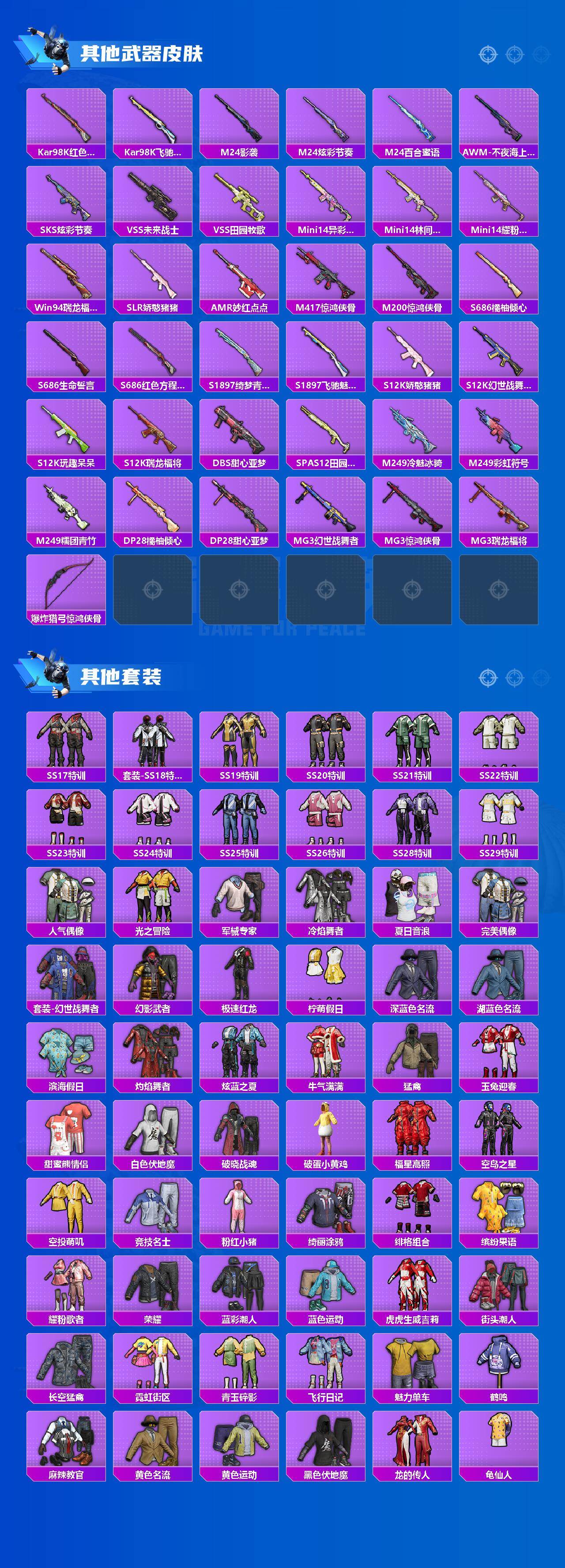 【稀有枪皮】:AKM-冰凉西瓜,AKM-彩虹符号,AKM-灼热熔岩,AKM-生命誓言,AKM-破晓战魂,AKM-虎虎生威,AKM-霓虹街区,AKM-龙的传人,M16A4-幻世战舞者,M16A4-甜心亚梦,M16A4-红色方程式,SCAR-L-炫彩节奏,SCAR-L-玉兔迎春,SCAR-L-红色方程式,M416-夜灯,M416-糯团青竹,M416-红色方程式,M416-蓝色火焰,GROZA-异彩先驱,GROZA-影袭,GROZA-林间仙鹿,GROZA-田园牧歌,AUG-天降萌叽,AUG-耀粉歌者,QBZ-彩虹符号,QBZ-飞驰魅影,M762-天降萌叽,M762-瑞龙福将,Mk47-林间仙鹿,Mk47-洛神天依,G36C-冷魅冰骑,G36C-绮梦青鸾,AC-VAL-天降萌叽,AC-VAL-甜心亚梦,蜜獾-天降萌叽,蜜獾-娇憨猪猪,UZI-天降萌叽,UZI-娇憨猪猪,UZI-影袭,UZI-炫彩节奏,UZI-红色方程式,UMP45-蓝色火焰,Vector-暗夜玫瑰,Vector-生命誓言,Vector-田园牧歌,Vector-百合蜜语,汤姆逊-天降萌叽,汤姆逊-异彩先驱,汤姆逊-炫彩节奏,汤姆逊-环太平洋,汤姆逊-耀粉歌者,MP5K-异彩先驱,P90-飞驰魅影,Kar98K-炫彩节奏,Kar98K-红色方程式,Kar98K-飞驰魅影,M24-影袭,M24-炫彩节奏,M24-百合蜜语,AWM-不夜海上花,