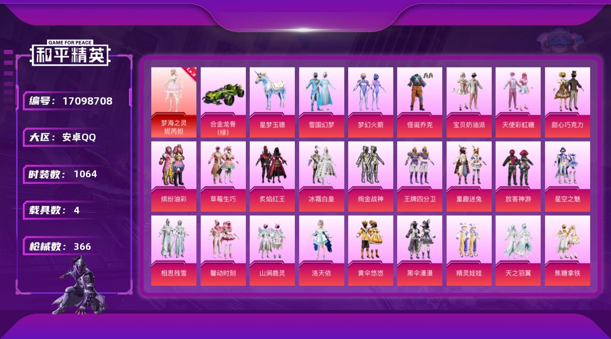 - [13712663]【店主推荐捡漏号!可直接换绑】安卓 手Q-无敌战神框-1神装-14粉装-15特效枪-6载具-7粉色飞行器-94673热力值-15王牌印记-178套装-260枪皮【红色神装等级】:灵猫魔法师-塞维尔(二级)【红色角色神装】:灵猫魔法师-塞维尔【热门品类】:粉装-雪国幻梦,粉装-梦幻火箭,粉装-童趣迷兔,粉装-缤纷油彩,套装-浪漫天命,套装-赤蝎幽灵,套装-都市猎人,套装-派对舞王,角色-忠义严颜,套装-龟仙人,套装-粉红小猪,套装-红红火火,熔岩游骑兵面罩,熔岩游骑兵连帽夹克【粉色载具】:宝马M4(圣保罗黄),迈凯伦塞纳(冷萃蓝),保时捷911 敞篷版(星珀红),踏焰逐风摩托车,僚机-冰龙团团,黑曜夜骑,冰绡玉鳞【粉色套装】:粉装-极限特训,粉装-雪国幻梦,粉装-梦幻火箭,粉装-缤纷油彩,粉装-放客神游,粉装-冰霜白皇,粉装-童趣迷兔,粉装-蜜桃特工,粉装-未来歌姬,粉装-室女星神,角色-烟云彩露,角色-月影灵韵,角色-凤凰座 一辉,粉装-星穹咏叹调【粉色枪皮等级】:AKM-梦之光华(六级),M416-五爪金龙(六级),M416-灵猫魔法师(六级),GROZA-镜光银凌(五级),AUG-暖羊咩咩(五级),M762-鬼刀(四级),汤姆逊-热量炸弹(五级),Kar98K-巳巳如意(五级),Mk14-甜梦熊击(五级),AMR-智耀战神(五级),DP-28-豹影疾电(五级),MG-36-幻彩电音(五级),MG-36-沧焰双生(五级),烟雾弹-电雾迷城(五级),破片手榴弹-美味星星糖(七级)【粉色枪皮】:AKM-梦之光华,M416-五爪金龙,M416-灵猫魔法师,GROZA-镜光银凌,AUG-暖羊咩咩,M762-鬼刀,汤姆逊-热量炸弹,Kar98K-巳巳如意,Mk14-甜梦熊击,AMR-智耀战神,DP-28-豹影疾电,MG-36-幻彩电音,MG-36-沧焰双生,烟雾弹-电雾迷城,破片手榴弹-美味星星【粉色飞行器】:拂晓神骑飞行器,镜域双华-灵镜之阶,冠军兔兔飞行器,灵猫魔法师飞行器,灵珠游龙飞行器