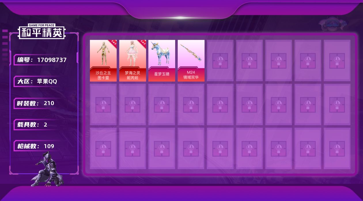 [17098737]【11595413】[11595413]WBDS0071 苹果Q 56套装 109枪皮 4神装3粉装9特效枪3载具 魔童闹海-哪吒 (4级) 圣域龙灵-瑞拉 (1级) 梦海之灵-妮芮妲 (1级) 沙丘之主-图卡盟 (1级) 星梦玉骢 踏焰逐风摩托车 圣域龙宝僚机 觉醒初号机 千金淑猫 羊梦糖心 P90-魔童闹海敖丙 (2级) SCAR-L-魔童闹海哪吒 (2级) Kar98K-圣域龙灵 (2级) Kar98K-巳巳如意 (5级) DP-28-豹影疾电 (1级) M200-梦海之灵 (3级) Mk14-盛世惊鸿 (3级) MK12-雪月幻音 (1级) M24-镜域双华 (3级) 幻海精灵飞行器 8号机 Mark.06