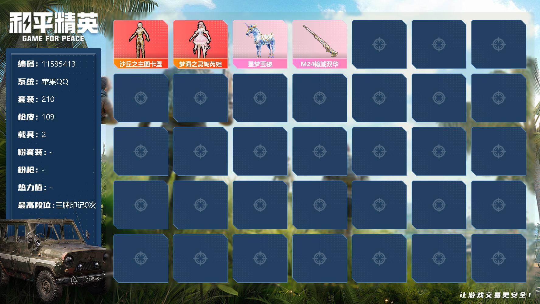 - [11416276]【商品标题】:安卓 手Q-9粉装-10特效枪-0载具-59968热力值-8印记-96套装-146枪皮 【角色神装】:盛世惊鸿-云鸾 【角色神装等级】:盛世惊鸿-云鸾(一级) 【特效枪等级】:M416-暖熊萌萌(三级),M416-墨龙九天(六级),GROZA-镜光银凌(五级),AUG-暖羊咩咩(五级),M762-鬼刀(二级),Kar98K-巳巳如意(五级),Kar98K-圣域龙灵(三级),SVD-月影灵韵(五级),SPAS-12-音爆索尼克(四级),MG3-炙焰牛王(七级) 【优质套装】:粉装-甜心巧克力,粉装-天使彩虹糖,粉装-绚丽摇曳,粉装-妙趣可丽,粉装-暗夜鎏金,粉装-莲影清波,角色-千金淑猫,角色-月影灵韵,角色-萨利娅 【稀有套装】:套装-龟仙人,套装-绒宝小鹅,套装-巳巳如意,角色-许七安,角色-俏兔智灵,角色-光矢逐梦,套装-燕燕于飞,套装-鱼渊荷华,角色-风玲,套装-晶辉守护,角色-糖霜甜心,角色-蜜桃派对,套装-蓝冰羽 【优质武器皮肤】:M416-暖熊萌萌,M416-墨龙九天,GROZA-镜光银凌,AUG-暖羊咩咩,M762-鬼刀,Kar98K-巳巳如意,Kar98K-圣域龙灵,SVD-月影灵韵,SPAS-12-音爆索尼克,MG3-炙焰牛王 【稀有武器皮肤】:AKM-彩虹符号,AKM-灼热熔岩,AKM-破晓战魂,M16A4-幻世战舞者,M16A4-甜心亚梦,M16A4-千金淑猫,SCAR-L-炫彩节奏,SCAR-L-玉兔迎春,SCAR-L-红色方程式,M416-糯团青竹,M416-紫翼圣骑,M416-红色方程式,M416-蓝色火焰,GROZA-懵萌河马,GROZA-田园牧歌,AUG-天降萌叽,AUG-甜蜜菠萝,AUG-耀粉歌者,AUG-月影灵韵,QBZ-妙趣可丽,QBZ-彩虹符号,QBZ-飞驰魅影,M762-天降萌叽,M762-暗夜鎏金,M762-橘柚倾心,M762-甜心宝贝,Mk47-妙红点点,G36C-懵萌河马,AC-VAL-天降萌叽,AC-VAL-快闪甜心,AC-VAL-甜心亚梦,蜜獾-垂柳戏鸭,蜜獾-天降萌叽,蜜獾-娇憨猪猪,Famas-墨龙九天,UZI-娇憨猪猪,UZI-月影灵韵,UMP45-仲夏莫吉托,UMP45-涂山之恋,UMP45-生命誓言,UMP45-绒宝小鹅,Vector-生命誓言,Vector-田园牧歌,汤姆逊-耀粉歌者,A