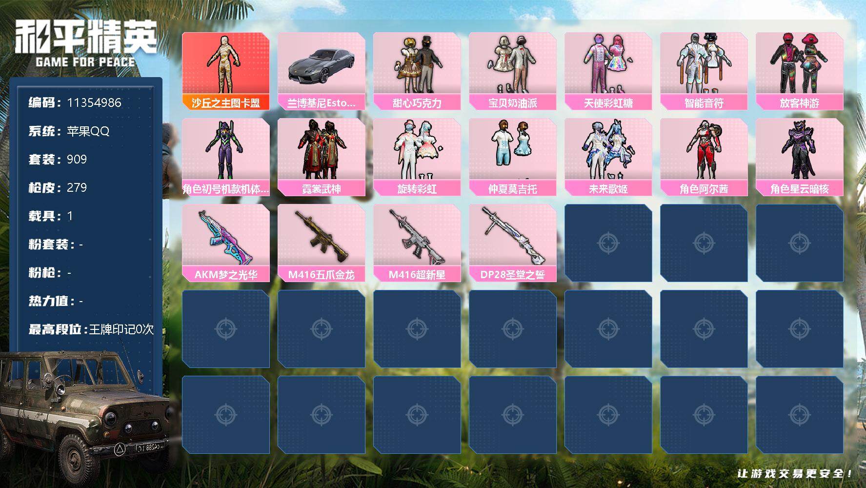 - [16142747]【特价出售/店主推荐】安卓 手Q-4粉装-3特效枪-3载具-2粉色飞行器-5.7w热力值-9王牌印记-120套装-186枪皮 【热门品类】:套装-龟仙人 【粉色套装】:粉装-蝶舞迷情,粉装-飓风飞鹰,粉装-吟月归客,角色-霁蓝缠春 【粉色枪皮等级】:Kar98K-巳巳如意(五级),DP-28-豹影疾电(五级) 【粉色载具】:兰博基尼Estoque(银翼灰),兰博基尼URUS(明艳黄),海龙奔腾 【粉色枪皮】:AUG-罪夜之冕,Kar98K-巳巳如意,DP-28-豹影疾电 【粉色飞行器】:夏日绵绵冰飞行器 【粉色降落伞】:四圣焕新降落伞,机甲封神降落伞,暗夜玫瑰降落伞,碧影闪光降落伞,环太平洋降落伞,灵感创作师降落伞,炫光之旅降落伞,千金淑猫降落伞,炫彩糖果降落伞 【稀有套装】:套装-龟仙人,套装-巳巳如意,套装-雪国风尚,角色-许七安,角色-灵公主,套装-炫彩糖果 【稀有枪皮】:AKM-冰凉西瓜,AKM-夜灯,AKM-彩虹符号,AKM-生命誓言,AKM-破晓战魂,AKM-虎虎生威,AKM-霓虹街区,AKM-龙的传人,M16A4-幻世战舞者,SCAR-L-夜灯,SCAR-L-炫彩节奏,SCAR-L-玉兔迎春,SCAR-L-红色方程式,SCAR-L-黄金龙骨,M416-糯团青竹,M416-红色方程式,M416-绯红前夜,M416-蓝色火焰,GROZA-异彩先驱,GROZA-黑色刀锋,AUG-天降萌叽,AUG-耀粉歌者,AUG-绝对恒星,QBZ-原初圣火,QBZ-彩虹符号,QBZ-洛神天依,QBZ-神秘黑猫,M762-天降萌叽,M762-彩虹符号,M762-牛气冲天,M762-瑞龙福将,M762-诡娃娃,M762-镭射皇者,G36C-时空追击者,AC-VAL-天降萌叽,蜜獾-天降萌叽,蜜獾-娇憨猪猪,UZI-啾咪啾咪,UZI-娇憨猪猪,UZI-炫彩节奏,UZI-烈焰拳霸,UZI-红色方程式,UMP45-时空追击者,UMP45-涂山之恋,UMP45-生命誓言,UMP45-蓝色火焰,UMP45-诡娃娃,Vector-彩虹符号,Vector-生命誓言,Vector-黑色刀锋,汤姆逊-天降萌叽,汤姆逊-幻影战神,汤姆逊-异彩先驱,汤姆逊-耀粉歌者,MP5K-异彩先驱,P90-巳巳如意,Kar98K-彩虹符号,Kar98K-炫彩节奏,Kar98K-王子的夏天,Kar98K-电玩视