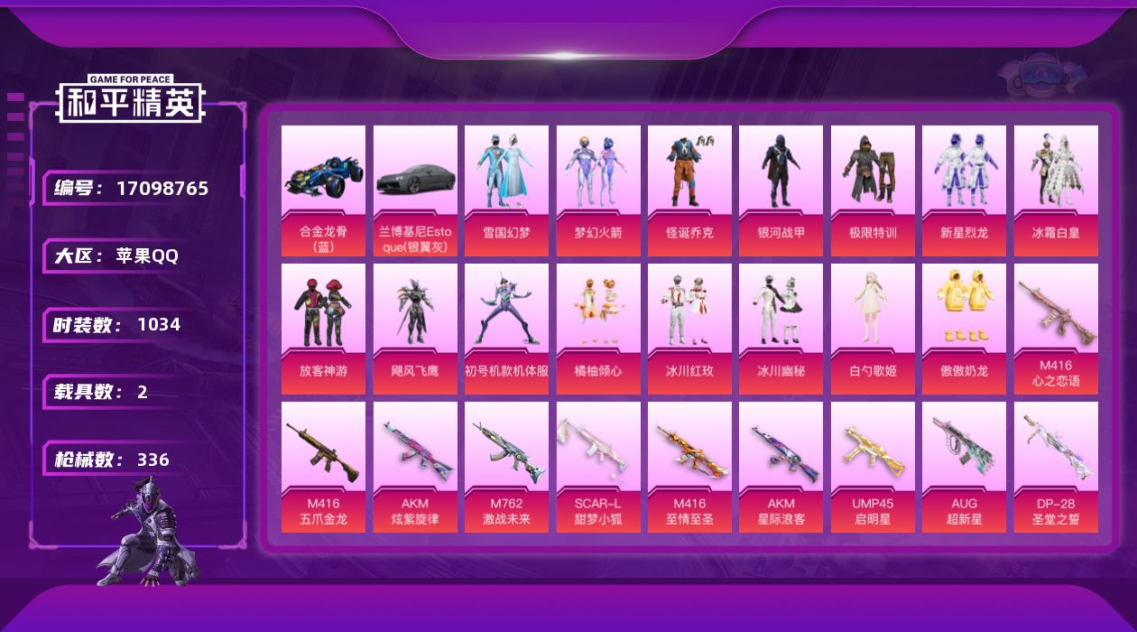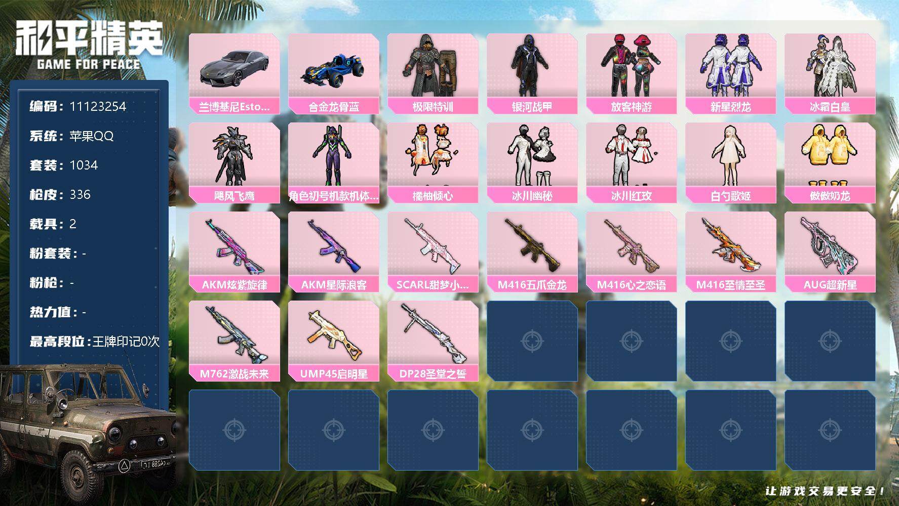 [17098765]【11123254】[11123254]WBDS0051 苹果Q 17粉装2载具15特效枪 怪诞乔克 觉醒初号机 紫螳螂 梦幻火箭 雪国幻梦 赤蝎幽灵 都市猎人 派对舞王 M416-至情至圣 (9级) AUG-超新星 (7级) 暗夜之虎 追光队服 260套装 336枪皮 兰博轿车灰色 合金龙骨蓝色 傲傲奶龙 樱桃泡泡 银河战甲 白勺歌姬 放客神游 橘柚倾心 极限特训 新星烈龙 冰川幽秘 冰霜白皇 飓风飞鹰 冰川红玫 M416-五爪金龙 (1级) M416-心之恋语 (1级) AKM-炫紫旋律 (5级) Kar98K-圣域龙灵 (3级) Kar98K-巳巳如意 (5级) DP-28-千金淑猫 (1级) DP-28-豹影疾电 (5级) GROZA-镜光银凌 (5级) AKM-星际浪客 (1级) M762-激战未来 (5级) DP-28-圣堂之誓 (5级) SCAR-L-甜梦小狐 (5级) UMP45-启明星 (5级) 暗翼战神飞行器 深渊漩涡飞行器 8号机 Mark.06 龟仙人 暗夜之虎 雪山精英 潮萌小黄鸭 恶魔人蛛 鹰眼刺客 好奇恐龙 激萌罗小黑 暗夜之虎 大橘为重 胖达团团 VS追光队服 暗夜契约 暗影哥特 团圆交子 瑞龙福将 狂沙舞者 漫步者 M762-瑞龙福将 M762-风花雪月 雪国精灵头盔 金曜白虎头盔 金风玉露头盔 深海小丑鱼头盔 梦幻火箭背包 雪国精灵背包 金曜白虎背包 甜心宝贝背包 百万伏特背包 萌熊伴侣背包 深海小丑鱼背包 夏日绵绵冰背包