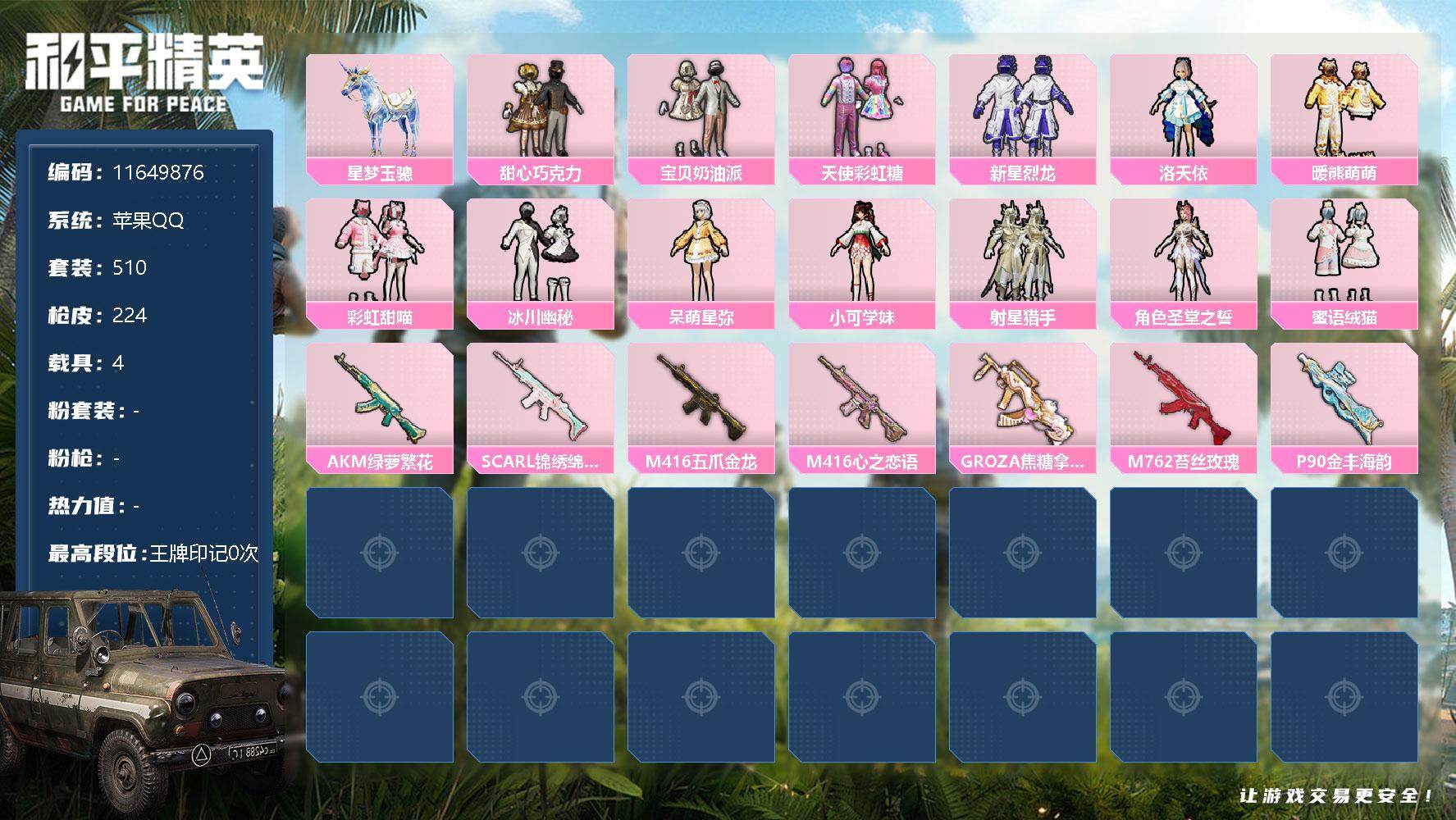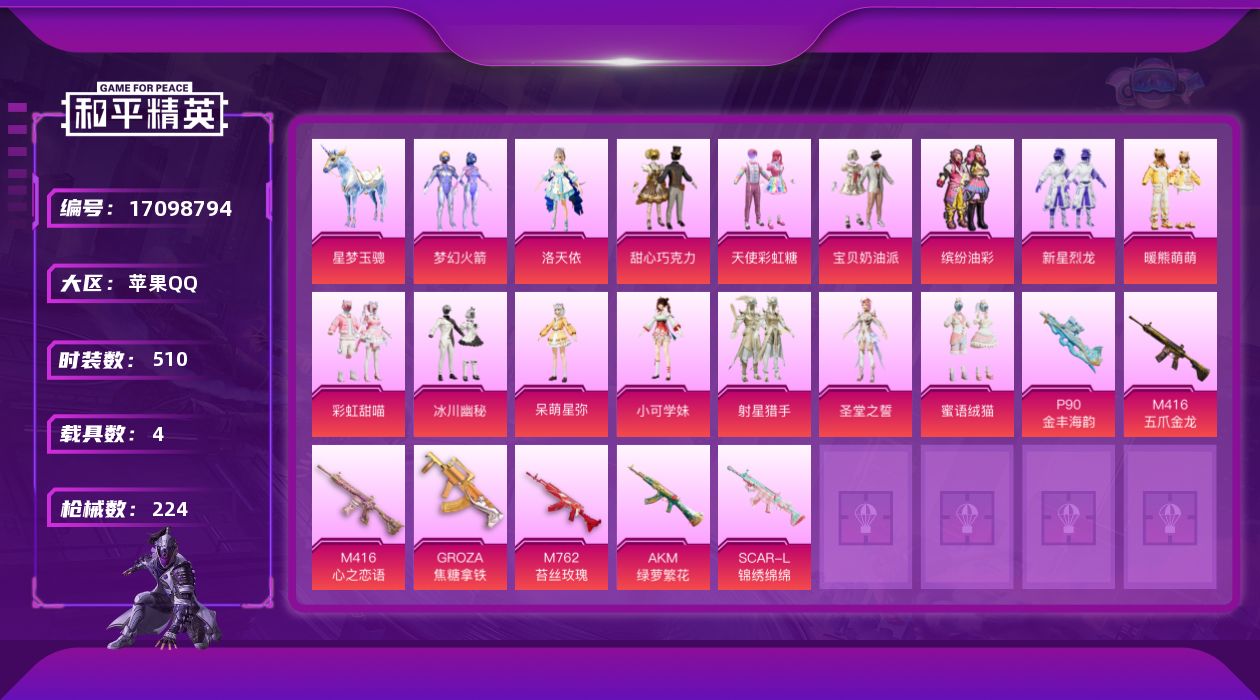 [17098794]【11649876】[11649876]HP0013 苹果Q148套装 224枪皮 【1神装22粉装13特效枪4载具】魔童闹海-哪吒 (2级) 玛莎拉蒂粉色 晶梦灵驹 黑曜夜骑 星梦玉骢 浪漫天命 圣堂之誓 梦幻火箭 小蓝 美琪 美雪 奇迹舞步美琪 蜜语绒猫 憨憨奶龙 宝贝奶油派 天使彩虹糖 甜心巧克力 千金淑猫 洛天依 呆萌星弥 小可学妹 射星猎手 幻彩电音 缤纷油彩 新星烈龙 冰川幽秘 暖熊萌萌 彩虹甜喵 M416-五爪金龙 (1级) SCAR-L-纯梦嫁纱 (5级) SCAR-L-锦绣绵绵 (5级) M416-心之恋语 (7级) P90-金丰海韵 (5级) AKM-绿萝繁花 (5级) Kar98K-巳巳如意 (5级) Vector-最终圣卫者 (3级) DP-28-千金淑猫 (5级) DP-28-豹影疾电 (4级) AUG-暖羊咩咩 (5级) Mk14-樱桃泡泡 (5级) GROZA-焦糖拿铁 (5级) 龙翔九天飞行器 梦幻火箭飞行器 齐天大圣飞行器 深渊漩涡飞行器 繁龙极客飞行器 镜光幻境飞行翼 萌物绒绒飞行器 白勺歌姬飞行器 龟仙人 鹰眼刺客 激萌罗小黑 暗影哥特 团圆交子 纯白誓言 漫步者 梦幻火箭头盔 甜心宝贝头盔 梦幻火箭背包 甜心宝贝背包 萌熊伴侣背包 甜蜜誓约背包