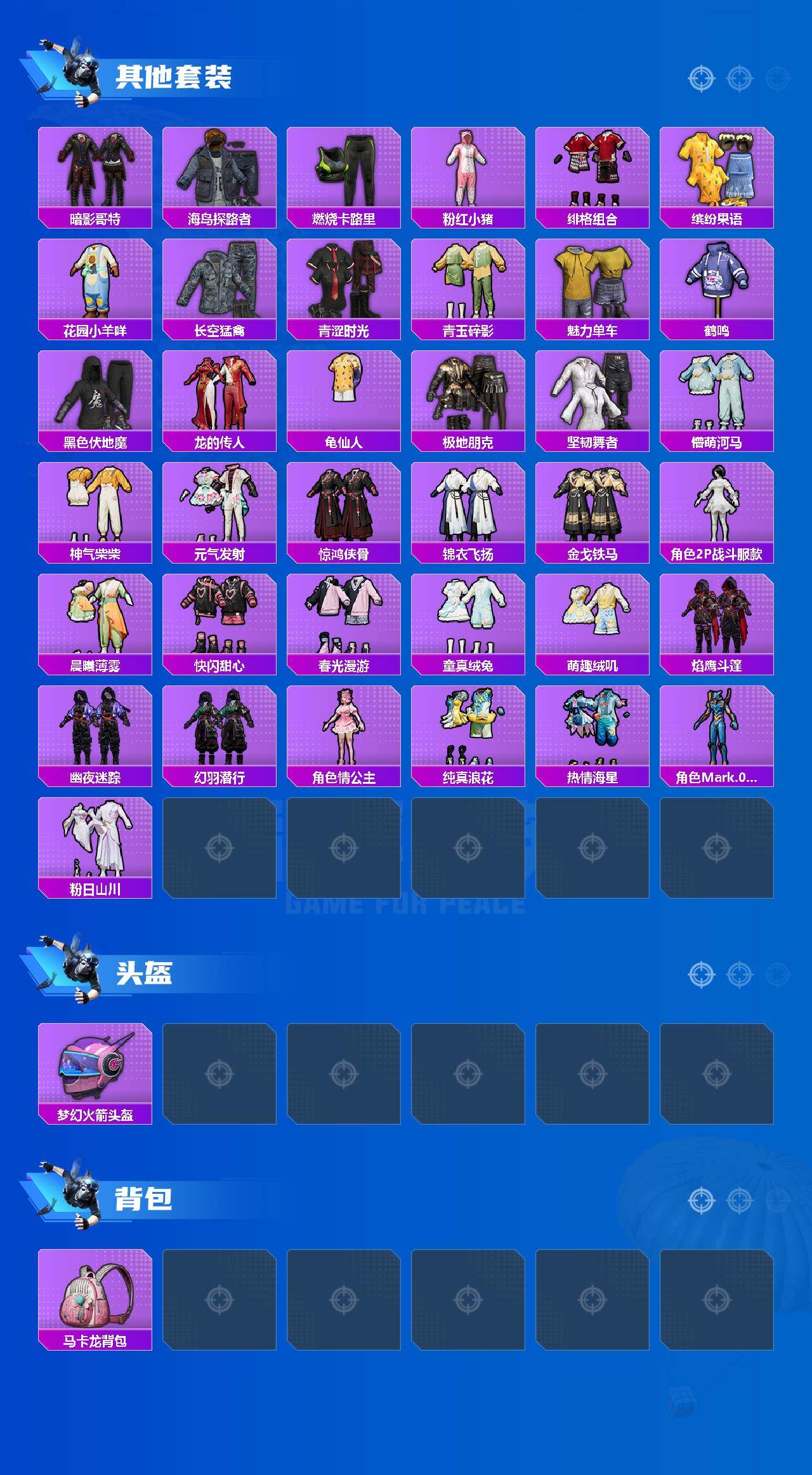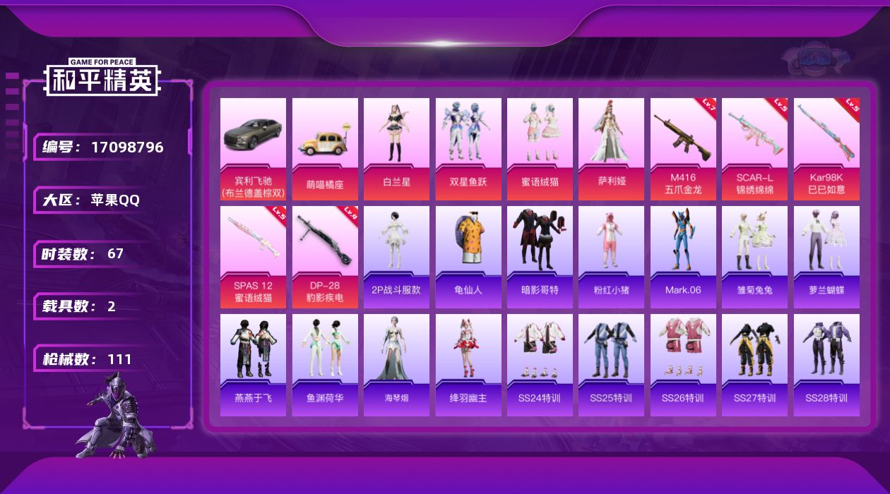 - [12015073]6粉装 3特效枪 1载具 11印记 可二次 可修改实名 身法装备:都市猎人,暗影哥特(红眼罩),萌熊伴侣背包(粉熊背包) 优质装备:合金龙骨(蓝),都市猎人,萌熊伴侣背包(粉熊背包),SCAR-L梦幻火箭,梦幻火箭(新101)(新火箭少女101粉色套装),数码大师,宝贝奶油派,天使彩虹糖,智能音符,AKM绿萝繁花,M416电玩时刻 热门装扮:光极星,鹰眼刺客,深海小丑鱼,都市猎人 六级特效枪:六级SCAR-L-梦幻火箭 五级特效枪:五级M416-电玩时刻,五级AKM-绿萝繁花 紫色装扮:田园牧歌,轻风白浪,和煦暖阳,SS22特训,SS23特训,幻彩翩翩,妙红点点,娇憨猪猪,萌趣咩咩,SS21特训,SS2特训,SS3特训,SS4特训,SS5特训,人气偶像,冰川特警,冷焰舞者,青涩时光,SS20特训,青春冒险家,潮流游乐家,SS15特训,暗夜傀儡,迪迦奥特曼,SS16特训,冰爽海盐,治愈之星,科技之星,SS14特训,萌趣颜团子,飞驰魅影,音速流光,SS19特训,吉莉礼服,甜心亚梦,虚音幻奏,瑞龙福将,团圆交子,SS17特训,异彩先驱,SS18特训,都市魅力,酒红色名流,酷潮明星,野性战心,长空猛禽,雨林探路者,雪山精英,霓虹极客,霓虹街区,青年教官,青春校园,迎春赐吉,风暴特警,缤纷果语,耀眼新星,蓝彩潮人,蓝色守护者,蓝色运动,街头潮人,西部风情,超能勇士,青涩年华,骑行爱好者,魅力单车,鹤鸣,黄色伏地魔,黄色名流,黄色运动,黑色伏地魔,龙的传人,沙漠毒蛇,朋克治安官,极地朋克,极速红龙,柠萌假日,橘黑制服,沙漠兵团,沙漠探路者,海岛探路者,深海格斗者,深蓝色名流,清新柠檬,滨海假日,幻影武者,坚韧舞者,夏日倾情,夏日音浪,夜莺强袭者,完美偶像,帅气教官,幻世战舞者,怒火燎原,战地督导,战地菁英,探宝勇士,湖蓝色名流,滨海厨神,绮丽涂鸦,疯狂小兔子,白熊同盟,白色伏地魔,破晓战魂,破蛋小黄鸡,神秘领域,福星高照,突袭者,竞技达人朋克,红色运动,王牌教练,牛气冲天,灼焰舞者,炫蓝之夏,热血青春,燃烧卡路里,牛气满满,猛禽,特战英豪,狂战萌兔,猎鹰,纯真浪花,热情海星,SS28特训,卖崽青蛙,暗影刺翼,玉兔迎春,竞技名士,暗影哥特(红眼罩),果汁能量,惊鸿侠骨,SS25特训,锦衣飞扬,超人强,焰鹰斗篷,幻羽潜行,幽夜迷踪,SS27特训,Alan Walker,浪漫天命