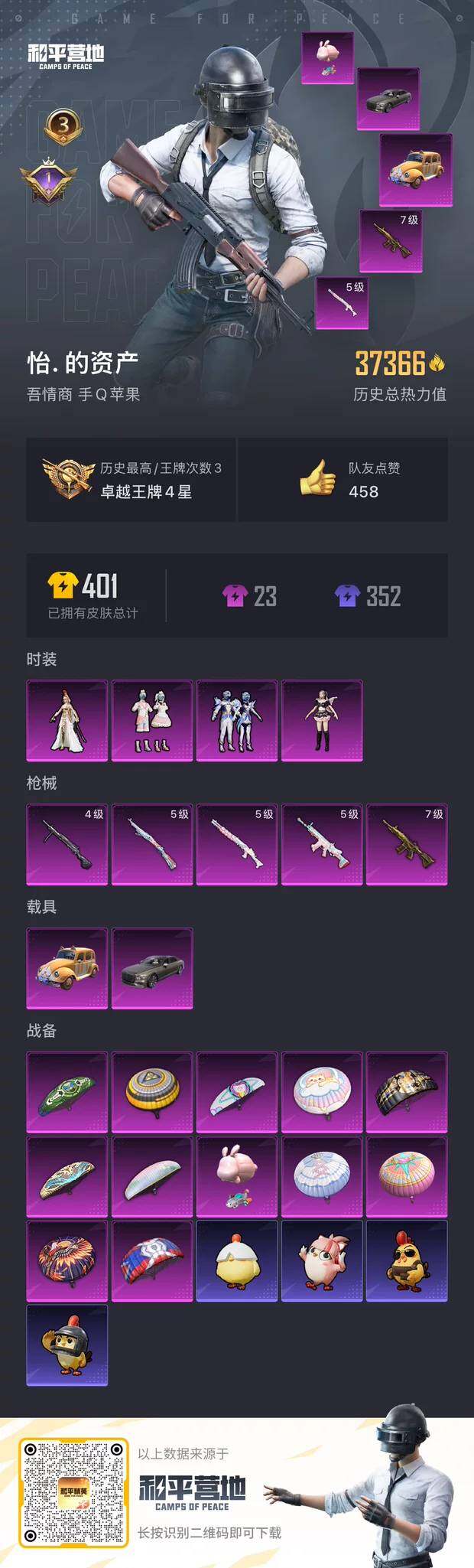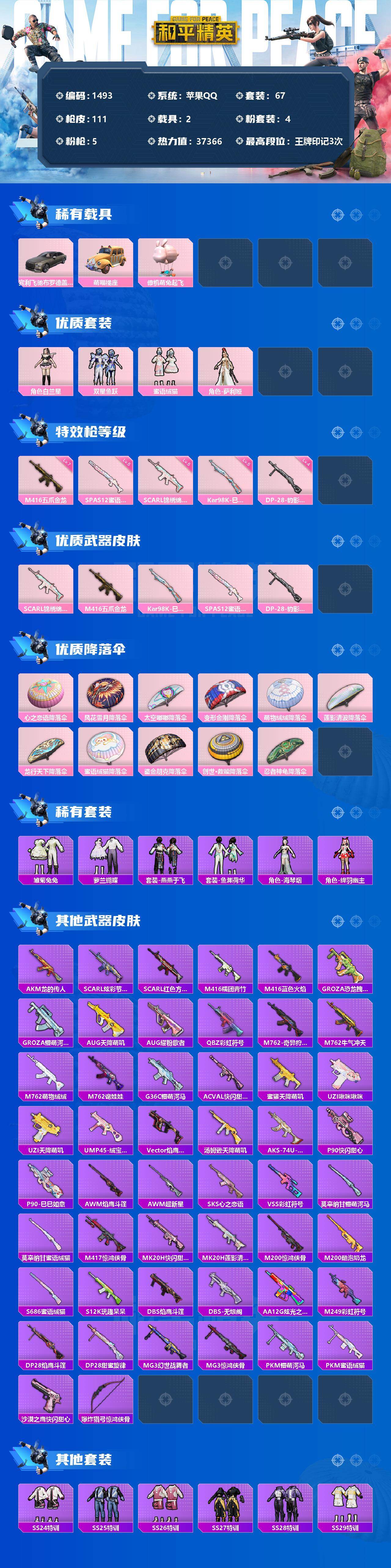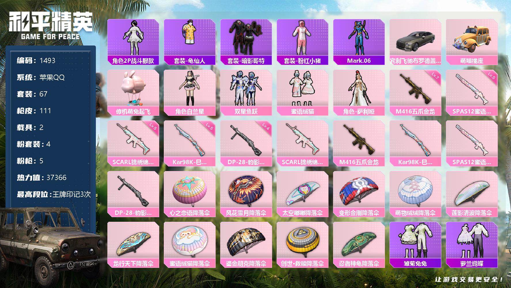 [17098796]【1493】苹果 手Q-4粉装-5特效枪-2载具-0粉色飞行器-37366热力值-3王牌印记-67套装-111枪皮