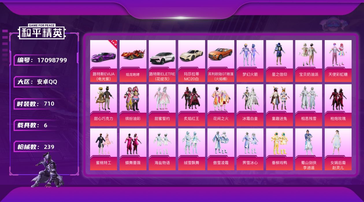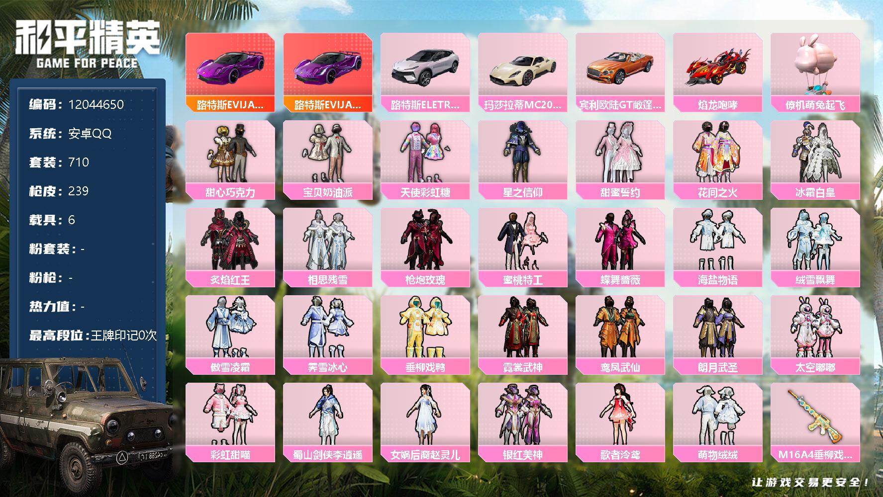 - [16023670]【店主推荐捡漏号!可直接换绑】苹果 手Q-10粉装-6特效枪-4载具-4粉色飞行器-94797热力值-17王牌印记-211套装-280枪皮【热门品类】:套装-浪漫天命,套装-都市猎人,套装-深海小丑鱼,套装-胖达圆圆,套装-金羽特工,套装-SS1特训,套装-龟仙人,套装-暗影哥特,套装-粉红小猪,角色-Mark.06【粉色载具】:宾利飞驰(布罗德盖棕双色),擎天重拳,永恒黄蜂,Formula E Gen2(巅峰兰)【粉色套装】:粉装-数码大师,粉装-智能音符,粉装-海盐物语,粉装-炙焰牛王,角色-复仇流浪者,粉装-旋转彩虹,粉装-未来歌姬,套装-创世·救赎,角色-初号机 觉醒Ver.,角色-异瞳寒姬【粉色枪皮等级】:AKM-魔法神域(三级),M16A4-垂柳戏鸭(五级),SCAR-L-青春物语(六级),M416-心之恋语(七级),Vector-环太平洋(六级),DP-28-豹影疾电(五级)【粉色枪皮】:AKM-魔法神域,M16A4-垂柳戏鸭,SCAR-L-青春物语,M416-心之恋语,Vector-环太平洋,DP-28-豹影疾电【粉色飞行器】:神秘黑猫飞行器,天之羽翼飞行器,深渊漩涡飞行器