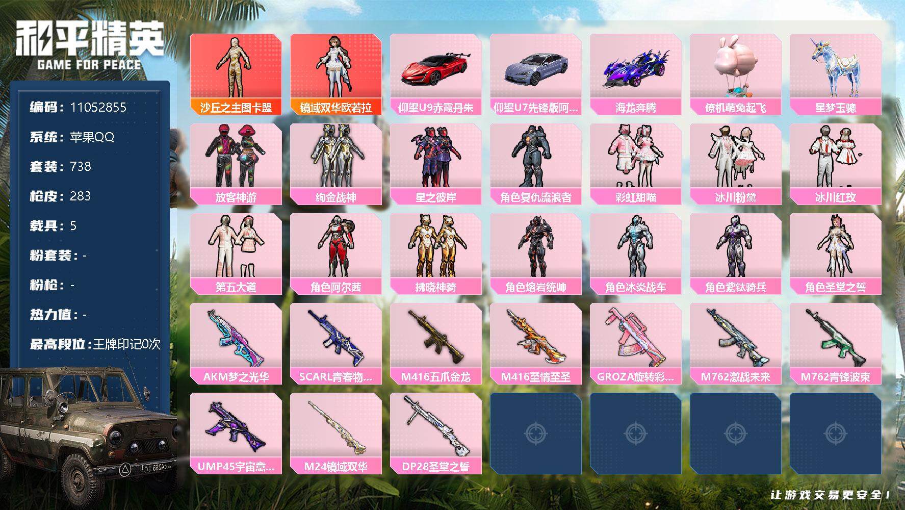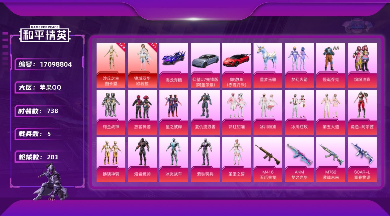 [17098804]【11052855】[11052855]WBDS0047 苹果Q 197套装 283枪皮 2神装23粉装6载具18特效枪 仰望U7先锋版(阿盖尔紫) 仰望U9(赤霞丹朱) 玛莎拉蒂Q蓝色 海龙奔腾 星梦玉骢 萌兔起飞僚机 镜域双华-欧若拉 (1级) 沙丘之主-图卡盟 (4级) 奇异狩猎者 赤蝎幽灵 都市猎人 浪漫天命 派对舞王 觉醒初号机 狂魅哈莉 圣堂之誓 梦幻火箭 盖世英雄 湮灭星辰 拂晓神骑 阿尔茜 星穹咏叹调 怪诞乔克 冰炎战车 熔岩统帅 紫钛骑兵 智耀战神 缤纷油彩 放客神游 第五大道 绚金战神 星之彼岸 彩虹甜喵 冰川粉黛 冰川红玫 复仇流浪者 M416-五爪金龙 (1级) SCAR-L-金蛇镇世 (3级) M416-墨龙九天 (2级) P90-沙丘之主 (3级) AKM-幽焰骑士 (6级) AKS-74U-星穹咏叹调 (5级) UMP45-宇宙意志 (3级) Kar98K-巳巳如意 (5级) M762-青锋波束 (5级) DP-28-豹影疾电 (4级) AUG-圣斗士星矢 (4级) Mk14-甜梦熊击 (5级) M24-镜域双华 (3级) M762-激战未来 (4级) M416-至情至圣 (7级) AKM-梦之光华 (1级) GROZA-旋转彩虹 (4级) SCAR-L-青春物语 (2级) 龙翔九天飞行器 梦幻火箭飞行器 镜光幻境飞行翼 Mark.06 龟仙人 萌神柯基 呆萌铁蟹 鹰眼刺客 暗夜行者 大橘为重 TEC追光队服 AG战队服 暗影哥特 团圆交子 瑞龙福将 粉红小猪 豚鼠丹丹 狂沙舞者 漫步者 破蛋小黄鸡 军刀雅典娜 英勇保护者 AKM-奇异狩猎者 M762-奇异狩猎者 M762-瑞龙福将 M24-奇异狩猎者 S686-奇异狩猎者 深海小丑鱼头盔 梦幻火箭背包 萌熊伴侣背包
