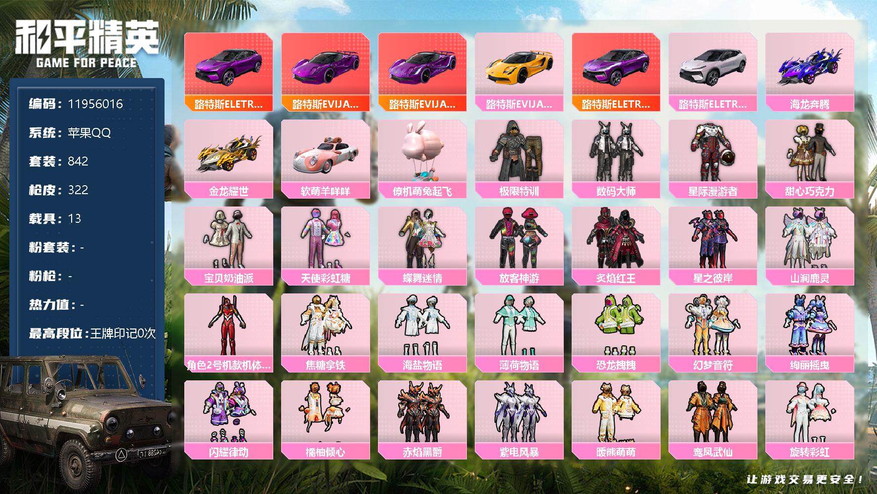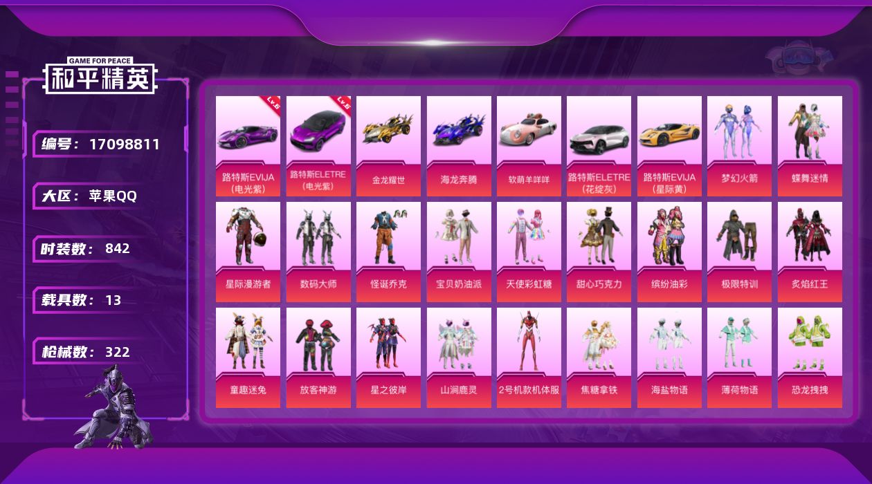 - [13079694]苹果 手Q-8粉装-7特效枪-2载具-4粉色飞行器-43825热力值-6王牌印记-72套装-115枪皮 【热门品类】:粉装-梦幻火箭 【粉色载具】:宝马M4(圣保罗黄),帕加尼imola(光影红) 【粉色套装】:粉装-梦幻火箭,粉装-第五大道,粉装-萌物绒绒,粉装-金丰海韵,角色-千金淑猫,角色-女娲灵识,角色-智耀战神,角色-羊梦糖心 【粉色枪皮等级】:AKM-魔法神域(三级),M416-心之恋语(六级),M762-青锋波束(五级),Kar98K-未来歌姬(六级),Kar98K-巳巳如意(五级),M417-第五大道(二级),DP-28-豹影疾电(五级) 【粉色枪皮】:AKM-魔法神域,M416-心之恋语,M762-青锋波束,Kar98K-未来歌姬,Kar98K-巳巳如意,M417-第五大道,DP-28-豹影疾电 【粉色飞行器】:酣梦熊熊飞行器,龙翔九天飞行器,深渊漩涡飞行器 【粉色降落伞】:粉色回忆降落伞,梦幻火箭降落伞,洛神天依降落伞,环太平洋降落伞,垂柳戏鸭降落伞,旋转彩虹降落伞,第五大道降落伞,萌物绒绒降落伞,超新星降落伞,沙丘之主降落伞,蜜语绒猫降落伞,镜域双华降落伞,精灵梦叶罗丽降落伞,宇宙意志降落伞,拳皇·狂花道降落伞,英伦信使降落伞,千金淑猫降落伞,晶梦幻蝶降落伞,星穹咏叹调降落伞,无垠阁降落伞 【稀有套装】:套装-巳巳如意,套装-雏菊兔兔,套装-萝兰蝴蝶,套装-小熊娃娃,角色-狂花道·娜可露露,套装-先驱飞行员,套装-糖糖葫芦,套装-青团波波,套装-棉花软糖,角色-都市丽猫,角色-临安公主,套装-燕燕于飞,套装-鱼渊荷华,角色-海琴烟,套装-星影赞美诗,套装-星渊小夜曲,套装-蓝海鲸歌,套装-朱霞炽焰,套装-凌霄紫焰,套装-擎苍青焰,玩偶服-懒羊羊,玩偶服-喜羊羊 【稀有枪皮】:AKM-星之彼岸,M16A4-千金淑猫,M762-第五大道,Mk47-摩登王国,Mk47-洛神天依,G36C-星穹咏叹调,AC-VAL-闲梦青缨,AC-VAL-六号稻草人,蜜獾-天降萌叽,ARX-凌霄紫焰,UZI-天降萌叽,UMP45-炫光之旅,Vector-生命誓言,汤姆逊-智耀战神,AKS-74U-鬼刀,JS9-凌霄紫焰,P90-甜蜜旋律,P90-金蛇镇世,P90-巳巳如意,Kar98K-星穹咏叹调,M24-拂晓神骑,M24-青空秋雨,M24-奇异狩猎者,SKS-炫彩