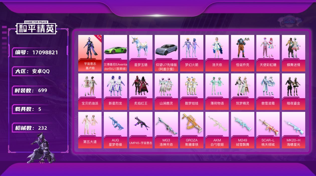 [17098821]【10798441】[10798441]WBDS0033 安卓Q【3神装15特效枪18粉装5载具】182套装 232枪皮 魔童闹海-哪吒 (1级) 精灵之光-露米娜 (4级) 宇宙意志-塞卢姆 (1级) 寒蝎幽灵 都市猎人 浪漫天命 派对舞王仰望U7先锋版(阿盖尔紫) 虚妄之影(炫耀紫) 兰博SVJ绿色 星梦玉骢 辉羽雀灵自行车 狂魅哈莉 梦幻火箭 蝶舞迷情 宝贝奶油派 天使彩虹糖 千金淑猫 洛天依 怪诞乔克 酣梦娃娃 幻彩电音 筑梦精灵 第五大道 新星烈龙 暗夜鎏金 炙焰红王 傲雪凌霜 薄荷物语 山涧鹿灵 M416-灵猫魔法师 (1级) AKM-幽焰骑士 (3级) AKM-白勺歌姬 (1级) UMP45-宇宙意志 (3级) Kar98K-巳巳如意 (5级) Vector-最终圣卫者 (2级) AUG-星梦奇缘 (3级) GROZA-精灵之光 (3级) SCAR-L-桃夭倾城 (2级) M417-第五大道 (2级) MG3-洛神天依 (7级) M249-绒雪飘舞 (5级) MK20-H-海螺星光 (4级) GROZA-焦糖拿铁 (6级) 烟雾弹-电雾迷城 (3级) 深渊漩涡飞行器 天之羽翼飞行器红熊茄茄 雪山精英 鹰眼刺客 暗影哥特 团圆交子 瑞龙福将 粉红小猪 狂沙舞者 漫步者 破蛋小黄鸡 英勇保护者 M762-奇异狩猎者 M762-瑞龙福将 S686-奇异狩猎者 Mini14-林间仙鹿 梦幻火箭头盔 甜心宝贝头盔 梦幻火箭背包 折纸暴龙背包 甜心宝贝背包 神秘黑猫背包 古堡领主背包