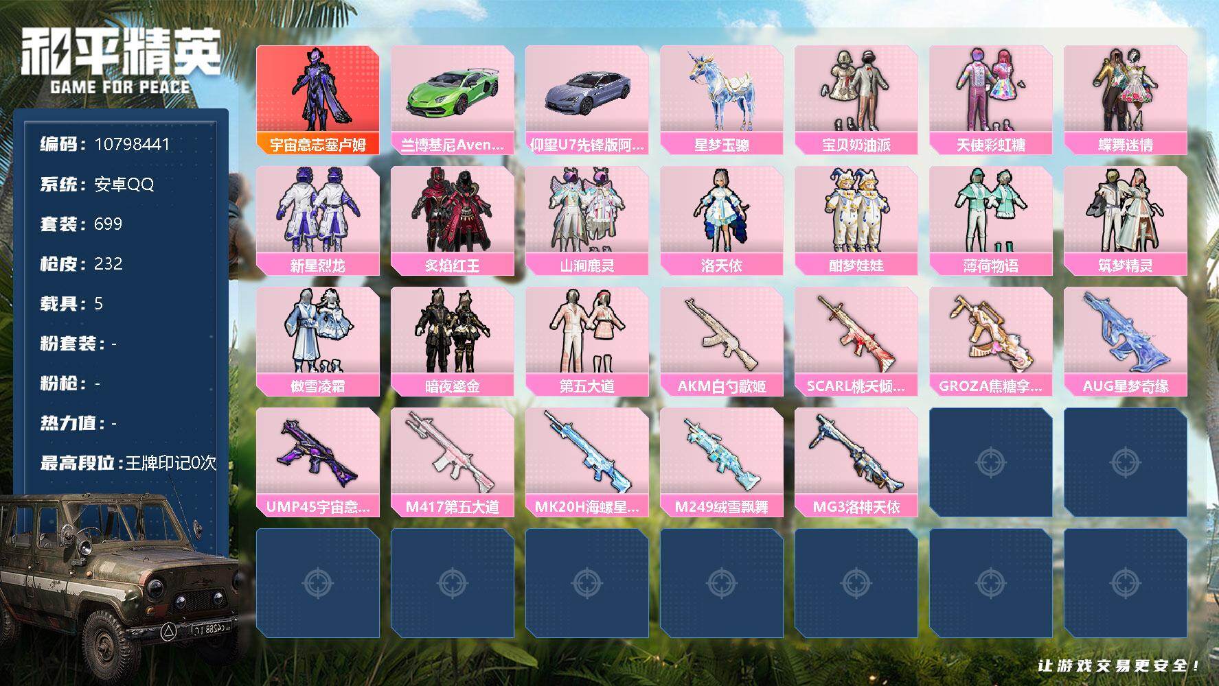 - [15149883]【特价出售/店主推荐】 安卓 手Q-1粉装-2特效枪-2载具-0粉色飞行器-50189热力值-6王牌印记-137套装-175枪皮 【热门品类】:套装-忍者信条,套装-SS1特训,套装-龟仙人,套装-暗影哥特,套装-粉红小猪,熔岩游骑兵连帽夹克 【粉色套装】:粉装-碧影闪光 【粉色枪皮等级】:M417-第五大道(七级),DP-28-豹影疾电(五级) 【粉色载具】:玛莎拉蒂Ghibli(粉),海龙奔腾 【粉色枪皮】:M417-第五大道,DP-28-豹影疾电 【粉色降落伞】:星之彼岸降落伞,恐龙拽拽降落伞,星穹咏叹调降落伞 【稀有套装】:套装-龟仙人,套装-雏菊兔兔,套装-萝兰蝴蝶,套装-紫幽梦,套装-蓝冰羽,套装-星渊小夜曲,套装-朱霞炽焰,套装-凌霄紫焰,角色-敖闰 【稀有枪皮】:AKM-冰凉西瓜,AKM-夜灯,AKM-彩虹符号,AKM-折纸暴龙,AKM-破晓战魂,AKM-龙的传人,M16A4-幻世战舞者,M16A4-机械英豪,M16A4-红色方程式,M16A4-蓝色火焰,SCAR-L-炫彩节奏,SCAR-L-红色方程式,SCAR-L-雷霆特警,SCAR-L-龙宫之主,M416-仓鼠灰灰,M416-潮汐统领,M416-生命誓言,M416-糯团青竹,M416-红色方程式,M416-蓝色火焰,GROZA-异彩先驱,GROZA-春暖花开,GROZA-黑色刀锋,AUG-天降萌叽,AUG-耀粉歌者,AUG-魔法学院,QBZ-原初圣火,QBZ-彩虹符号,QBZ-飞驰魅影,M762-折纸暴龙,M762-拳皇97,M762-牛气冲天,M762-瑞龙福将,Mk47-炫光之旅,G36C-金风玉露,G36C-星穹咏叹调,蜜獾-垂柳戏鸭,蜜獾-天降萌叽,蜜獾-御兔特攻,ARX-凌霄紫焰,UZI-生命誓言,UZI-红色方程式,UMP45-海渊国主,UMP45-荒野猎神,UMP45-蓝色火焰,Vector-彩虹符号,Vector-黑色刀锋,汤姆逊-天降萌叽,汤姆逊-奇异狩猎者,汤姆逊-幻影战神,汤姆逊-异彩先驱,汤姆逊-耀粉歌者,野牛-机械英豪,MP5K-异彩先驱,JS9-凌霄紫焰,P90-飞驰魅影,Kar98K-彩虹符号,Kar98K-炫彩节奏,Kar98K-红色方程式,Kar98K-飞驰魅影,M24-炫彩节奏,M24-冰封烈焰,SKS-夜灯,SKS-心之恋语,SKS-炫彩节奏,VSS-黑色