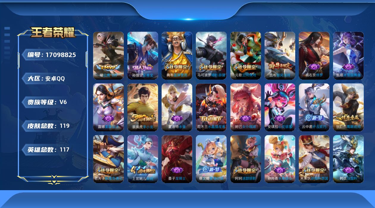 - PX_2097182-36 安卓QQ/至尊星耀/214皮肤/125英雄/1典藏/0珍品无双/0无双/0珍品传说/23传说/57史诗/9稀有英雄 【1 典藏皮肤】银白咏叹调 铠, 【23 传说皮肤】枫霜尽 橘右京,启明星使 虞姬,碎云 百里守约,无双飞将 马超,云鹰飞将 曜,齐天大圣 孙悟空,炽阳神光 镜,黄金射手座 后羿,无尽星芒 后羿,怒海麟威 吕布,时之恋人 刘备,挚爱之约 孙策,绯月行 不知