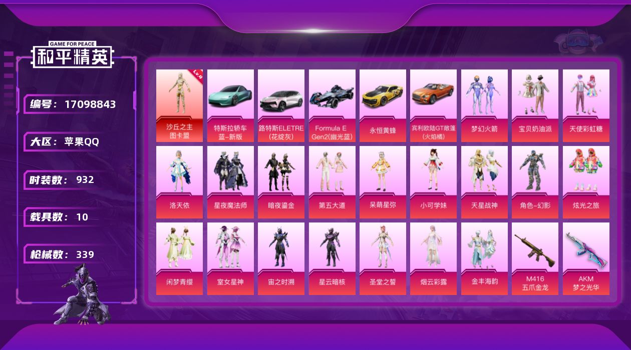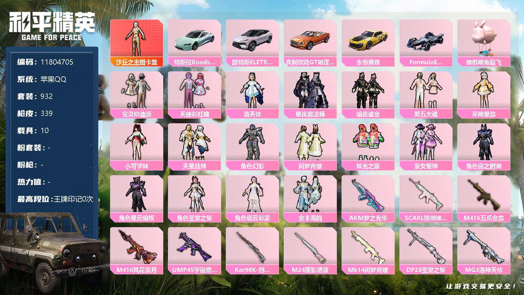 [17098843]【11804705】[11804705]HP0019 苹果Q 2红装2稀有11载具24粉装17特效枪253套装339枪皮 幽焰骑士-维塔 (1级) 沙丘之主-图卡盟 (4级) 火箭少女101 都市猎人 圣堂之誓 梦幻火箭 宝贝奶油派 天使彩虹糖 千金淑猫 洛天依 金丰海韵 烟云彩露 樱桃泡泡 幻影 天星战神 炫光之旅 星穹咏叹调 金域紫灵 羊梦糖心 呆萌星弥 小可学妹 室女星神 闲梦青缨 宙之时溯 星云暗核 第五大道 暗夜鎏金 星夜魔法师 M416-五爪金龙 (1级) SCAR-L-锦绣绵绵 (5级) M416-墨龙九天 (3级) P90-沙丘之主 (3级) AKS-74U-星穹咏叹调 (5级) UMP45-宇宙意志 (3级) Kar98K-巳巳如意 (5级) MG3-辉羽雀灵 (3级) DP-28-千金淑猫 (2级) DP-28-豹影疾电 (4级) Mk14-闲梦青缨 (4级) GROZA-精灵之光 (3级) Kar98K-创世救赎 (1级) AKM-梦之光华 (6级) M24-莲影清波 (1级) M416-风花雪月 (6级) MG3-洛神天依 (5级) 路特斯EL灰色 宝马M4(圣保罗黄) 宾利欧陆GT火焰橘 玛莎拉蒂粉色 Formula(幽光蓝) 特斯拉R水滴蓝 时空跃影(星辉银) 永恒黄蜂 晶梦灵驹 最终圣卫者摩托车 萌兔起飞僚机 8号机 龟仙人 仓鼠灰灰 雪山精英 潮萌小黄鸭 鹰眼刺客 怪笑疯兔 诡面顽熊 狂沙舞者 漫步者 破蛋小黄鸡 新侠客行 极速红龙 M762-奇异狩猎者 龙翔九天飞行器 春暖花开飞行器 深渊漩涡飞行器 梦幻舞会飞行器 星夜魔法师飞行翼 精灵迷巫头盔 梦幻火箭头盔 甜心宝贝头盔 九霄背包 梦幻火箭背包 甜心宝贝背包