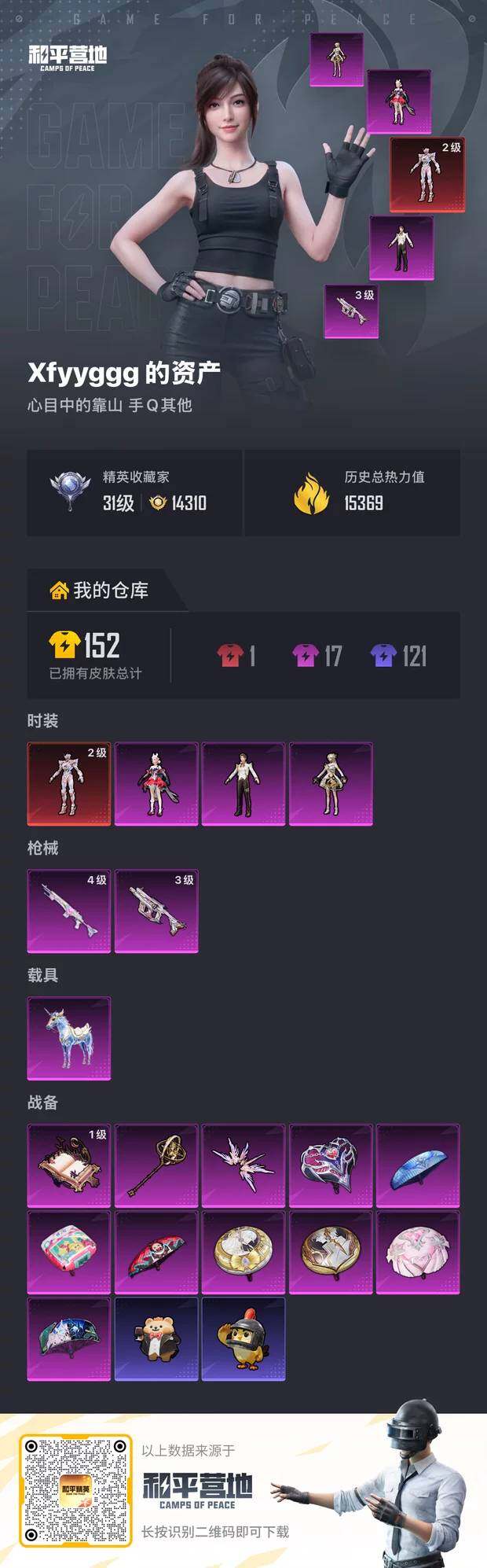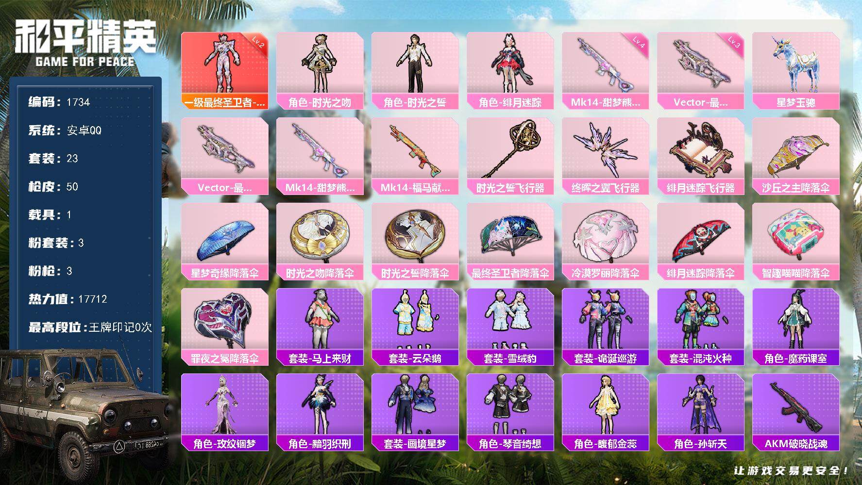 [17101685]【1734】安卓 手Q-1神装-3粉装-3特效枪-1载具-3粉色飞行器-17712热力值-0王牌印记-23套装-50枪皮