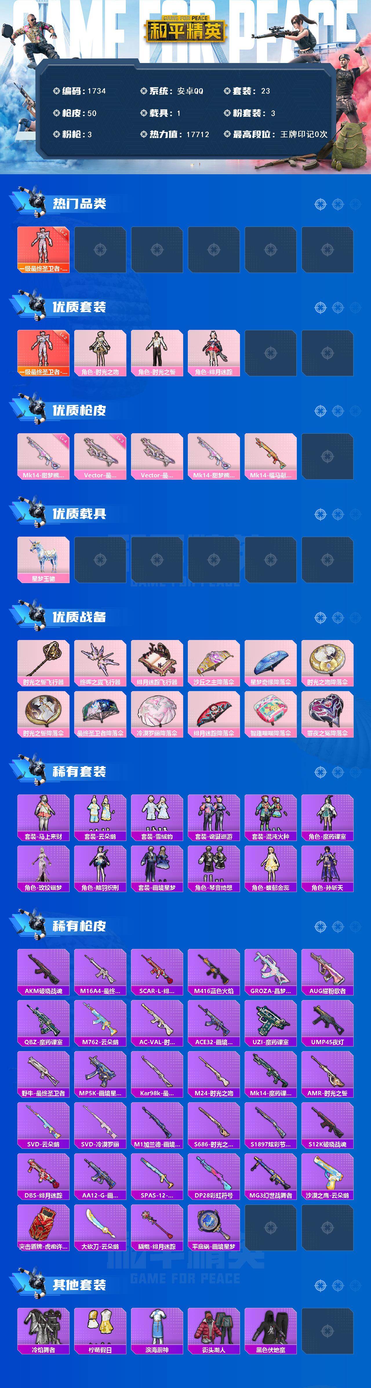 [17101685]【1734】安卓 手Q-1神装-3粉装-3特效枪-1载具-3粉色飞行器-17712热力值-0王牌印记-23套装-50枪皮 【红色神装等级】:最终圣卫者-帕修斯(二级) 【红色角色神装】:最终圣卫者-帕修斯 【粉色套装】:角色-时光之吻,角色-时光之誓,角色-绯月迷踪 【粉色枪皮等级】:Vector-最终圣卫者(三级),Mk14-甜梦熊击(四级) 【粉色载具】:星梦玉骢 【粉色枪皮】:Vector-最终圣卫者,Mk14-甜梦熊击,Mk14-福马献瑞 【粉色飞行器】:时光之誓飞行器,终晖之翼飞行器,绯月迷踪飞行器 【粉色降落伞】:沙丘之主降落伞,星梦奇缘降落伞,时光之吻降落伞,时光之誓降落伞,最终圣卫者降落伞,冷漠罗丽降落伞,绯月迷踪降落伞,智趣喵喵降落伞,罪夜之冕降落伞 【稀有套装】:套装-马上来财,套装-云朵鹅,套装-雪绒豹,套装-诡诞巡游,套装-混沌火种,角色-魔药课室,角色-玫纹锢梦,角色-黯羽织刑,套装-画境星梦,套装-琴音绮想,角色-馥郁金蕊,角色-孙斩天 【稀有枪皮】:AKM-破晓战魂,M16A4-最终圣卫者,SCAR-L-绯月迷踪,M416-蓝色火焰,GROZA-晶梦幻蝶,AUG-耀粉歌者,QBZ-魔药课室,M762-云朵鹅,AC-VAL-时光之吻,ACE32-画境星梦,UZI-魔药课室,UMP45-夜灯,野牛-最终圣卫者,MP5K-画境星梦,Kar98k-最终圣卫者,M24-时光之吻,Mk14-魔药课室,AMR-时光之誓,SVD-云朵鹅,SVD-冷漠罗丽,M1加兰德-画境星梦,S686-时光之誓,S1897-炫彩节奏,S12K-破晓战魂,DBS-绯月迷踪,AA12-G-画境星梦,SPAS-12-云朵鹅,DP-28-彩虹符号,MG3-幻世战舞者,沙漠之鹰-云朵鹅,突击盾牌-虎痴许褚,大砍刀-云朵鹅,撬棍-绯月迷踪,平底锅-画境星梦 【其他套装】:套装-冷焰舞者,套装-柠萌假日,套装-滨海厨神,套装-街头潮人,套装-黑色伏地魔 【营地ID】:1048237306