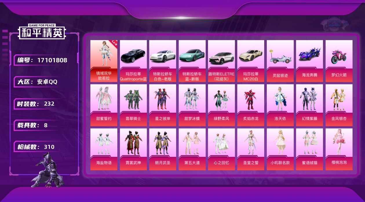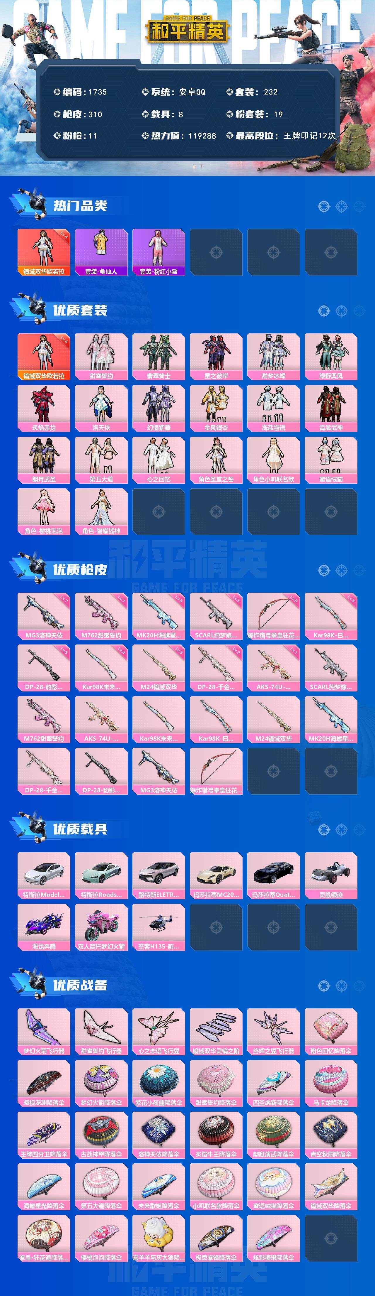 [17101808]【1735】安卓 手Q-1神装-19粉装-11特效枪-8载具-5粉色飞行器-119288热力值-12王牌印记-232套装-310枪皮 【红色神装等级】:镜域双华-欧若拉(四级) 【红色角色神装】:镜域双华-欧若拉 【热门品类】:套装-龟仙人,套装-粉红小猪 【粉色套装】:粉装-甜蜜誓约,粉装-翡翠骑士,粉装-星之彼岸,粉装-甜梦冰蝶,粉装-绿野柔风,粉装-炙焰赤龙,角色-洛天依,粉装-幻情紫藤,粉装-金风银杏,粉装-海盐物语,粉装-霓裳武神,粉装-朗月武圣,粉装-第五大道,粉装-心之回忆,角色-圣堂之誓,角色-小叽联名款,粉装-蜜语绒猫,角色-樱桃泡泡,角色-智耀战神 【粉色枪皮等级】:SCAR-L-纯梦嫁纱(五级),M762-甜蜜誓约(七级),AKS-74U-星穹咏叹调(一级),Kar98K-未来歌姬(四级),Kar98K-巳巳如意(五级),M24-镜域双华(三级),MK20-H-海螺星光(五级),DP-28-千金淑猫(二级),DP-28-豹影疾电(五级),MG3-洛神天依(七级),爆炸猎弓-拳皇·狂花道(五级) 【粉色载具】:特斯拉Model 3(珍珠白),特斯拉Roadster(水滴蓝),路特斯ELETRE(花绽灰),玛莎拉蒂MC20(星石白),玛莎拉蒂Quattroporte(夜幕蓝),灵鼠银迹,海龙奔腾,双人摩托-梦幻火箭,空客H135-蔚蓝之翼 【粉色枪皮】:SCAR-L-纯梦嫁纱,M762-甜蜜誓约,AKS-74U-星穹咏叹调,Kar98K-未来歌姬,Kar98K-巳巳如意,M24-镜域双华,MK20-H-海螺星光,DP-28-千金淑猫,DP-28-豹影疾电,MG3-洛神天依,爆炸猎弓-拳皇·狂花道 【粉色飞行器】:梦幻火箭飞行器,甜蜜誓约飞行器,心之恋语飞行翼,镜域双华-灵镜之阶,终晖之翼飞行器 【粉色降落伞】:粉色回忆降落伞,凝视深渊降落伞,梦幻火箭降落伞,繁花小夜曲降落伞,甜蜜誓约降落伞,四圣焕新降落伞,马卡龙降落伞,王牌四分卫降落伞,古战神甲降落伞,洛神天依降落伞,炙焰牛王降落伞,翩跹演武降落伞,青空秋雨降落伞,海螺星光降落伞,第五大道降落伞,未来歌姬降落伞,小叽联名款降落伞,蜜语绒猫降落伞,镜域双华降落伞,拳皇·狂花道降落伞,樱桃泡泡降落伞,喜羊羊与灰太狼降落伞,极意拳锋降落伞,炫彩糖果降落伞 【稀有套装】:套装-龟仙人,套装-雪国风尚,套