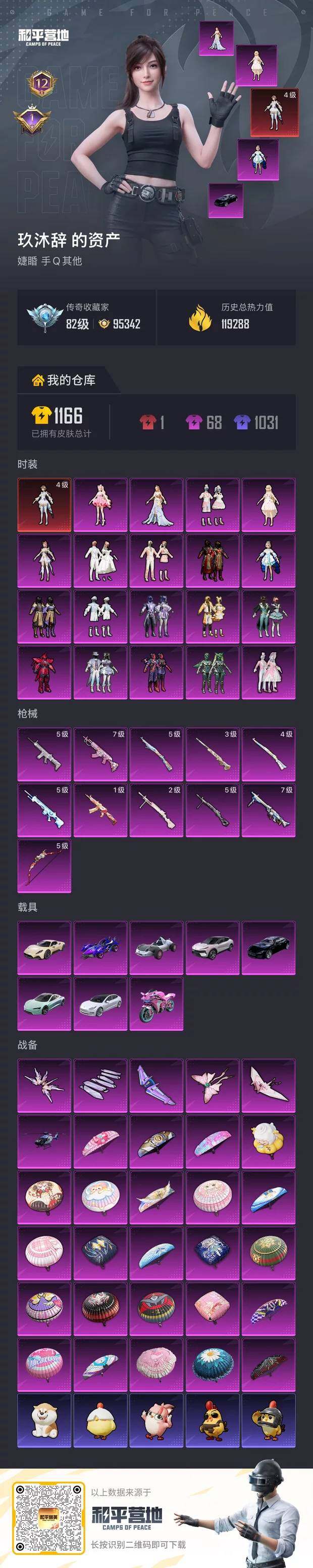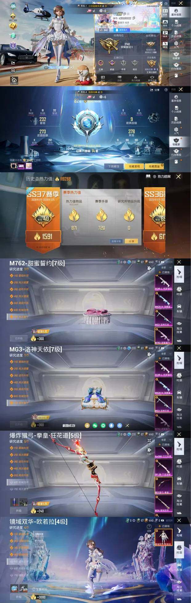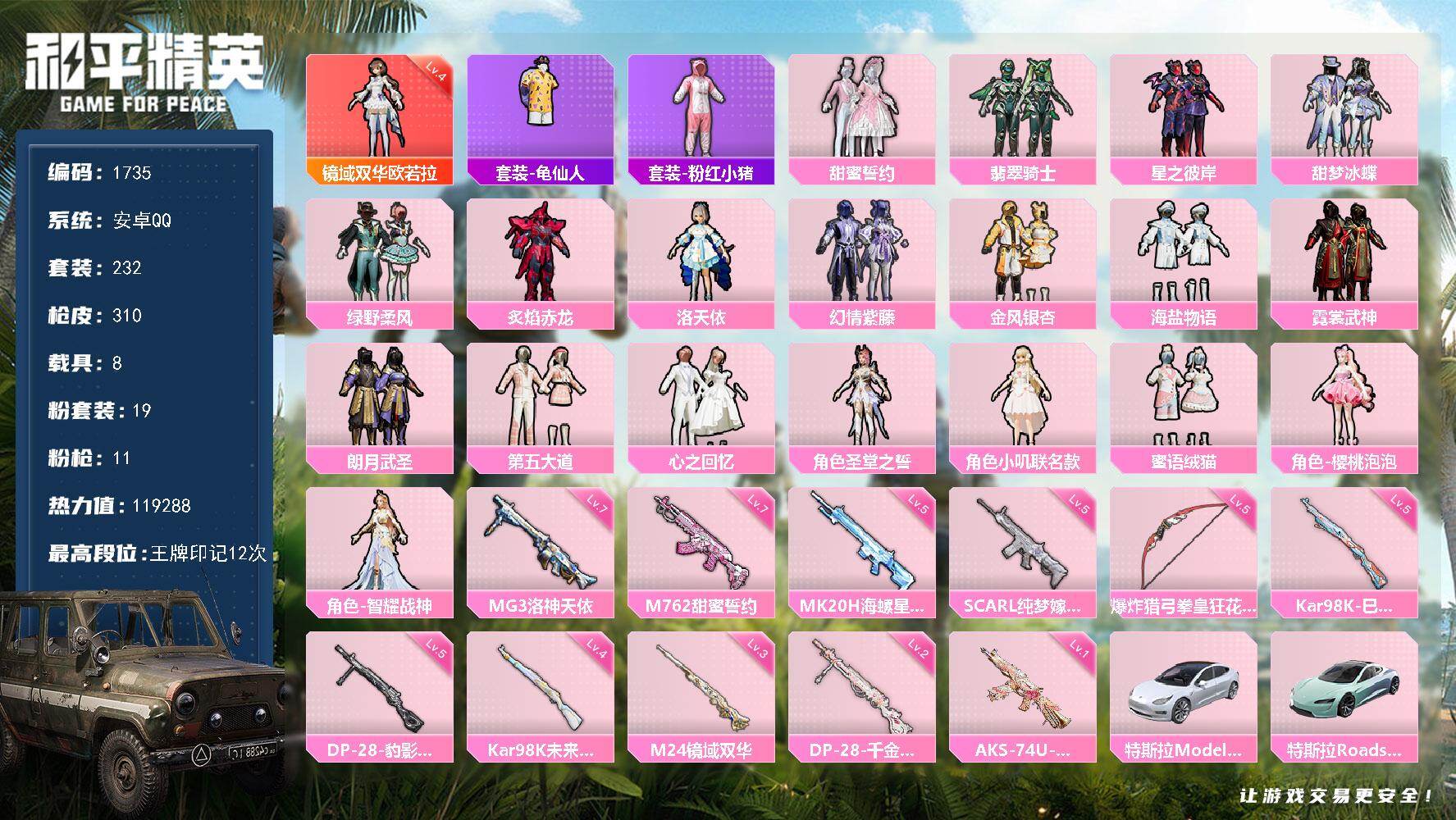 [17101808]【1735】安卓 手Q-1神装-19粉装-11特效枪-8载具-5粉色飞行器-119288热力值-12王牌印记-232套装-310枪皮