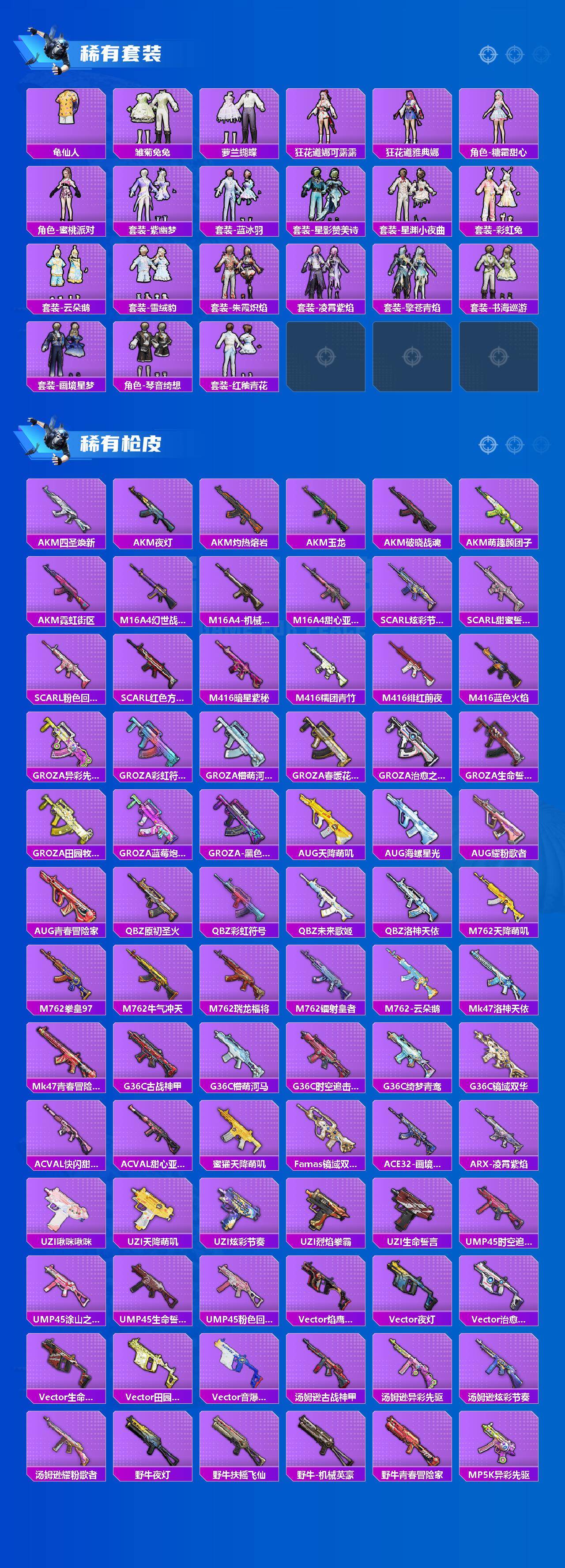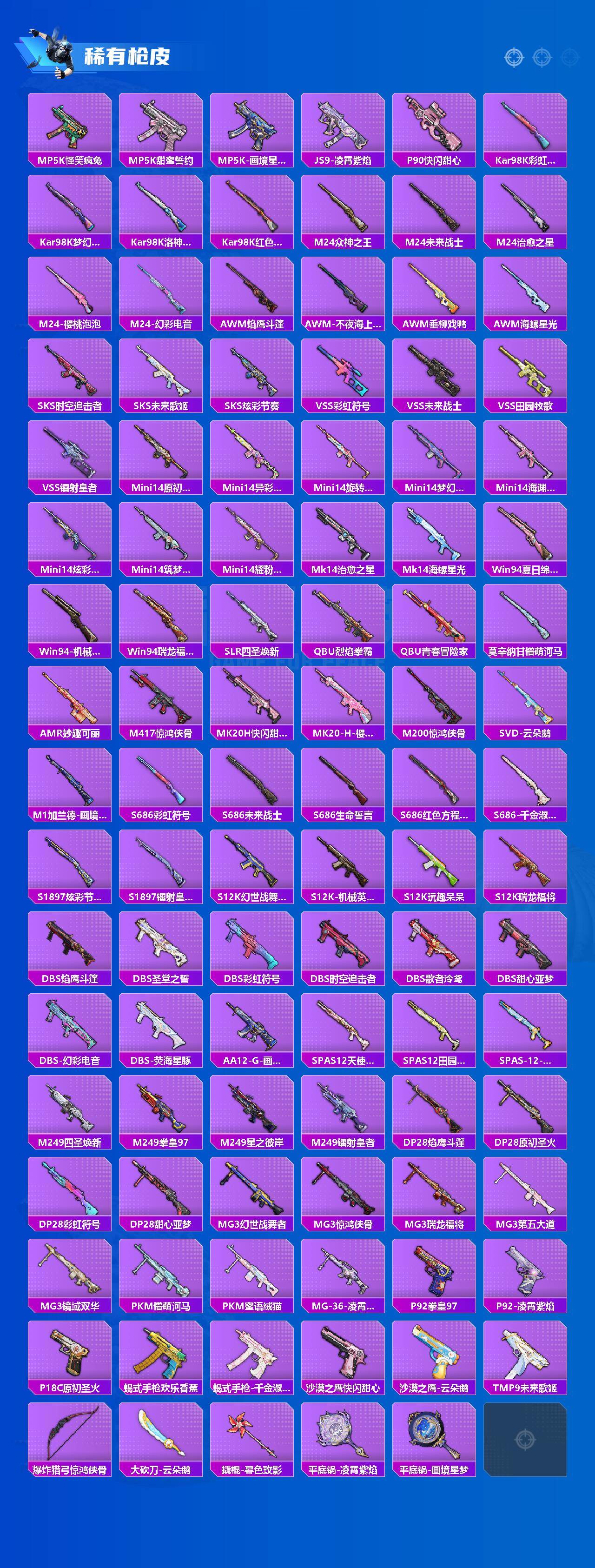 SCAR-L-纯梦嫁纱,M762-甜蜜誓约,Kar98K-未来歌姬,Kar98K-巳巳如意,M24-镜域双华,MK20-H-海螺星光,DP-28-千金淑猫,MG3-洛神天依,爆炸猎弓-拳皇·狂花道