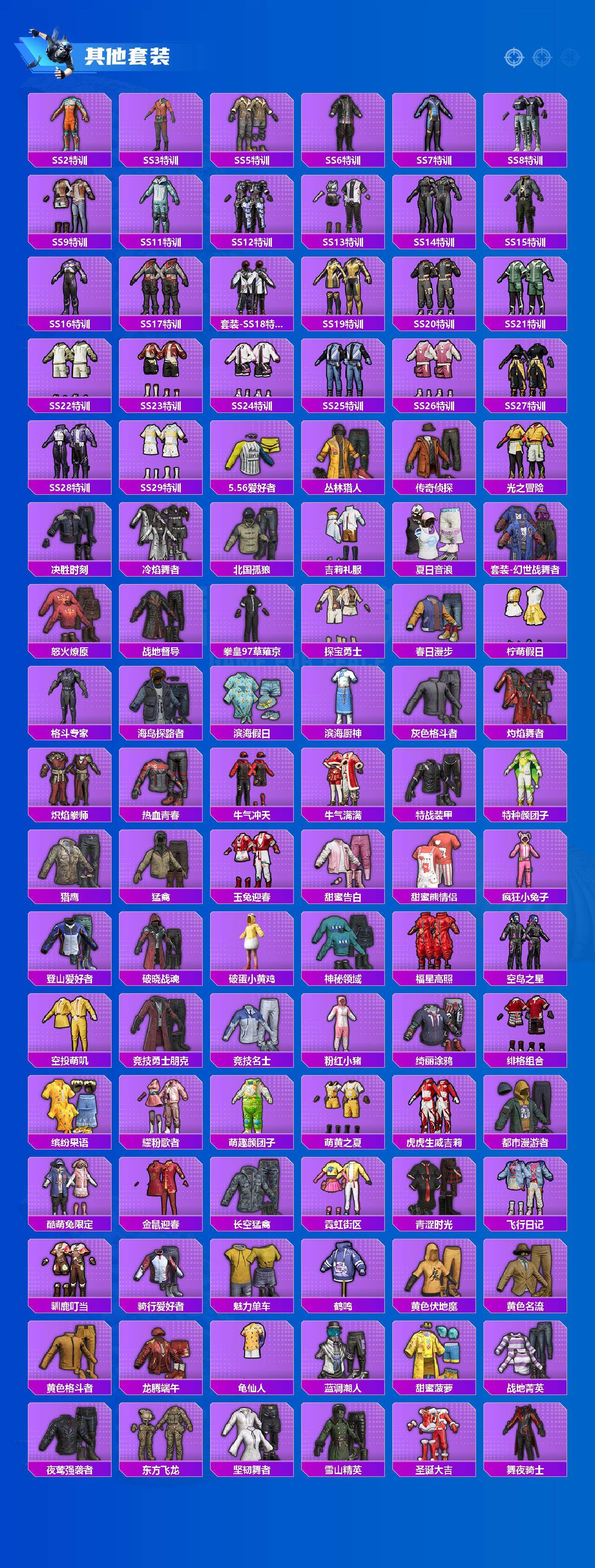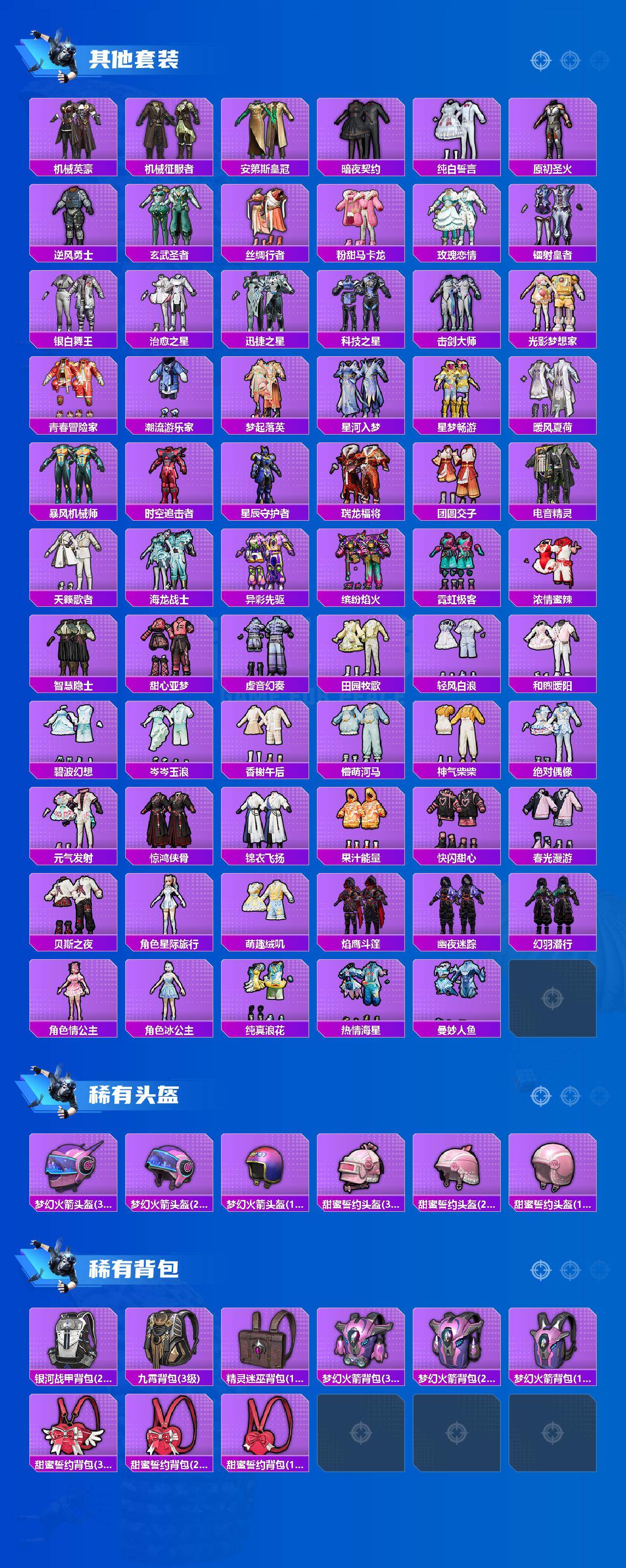 【粉色套装】:粉装-甜蜜誓约,粉装-翡翠骑士,粉装-星之彼岸,粉装-甜梦冰蝶,粉装-绿野柔风,粉装-炙焰赤龙,角色-洛天依,粉装-幻情紫藤,粉装-金风银杏,粉装-海盐物语,粉装-霓裳武神,粉装-朗月武圣,粉装-第五大道,粉装-心之回忆,角色-圣堂之誓,角色-小叽联名款,粉装-蜜语绒猫,角色-樱桃泡泡,角色-智耀战神