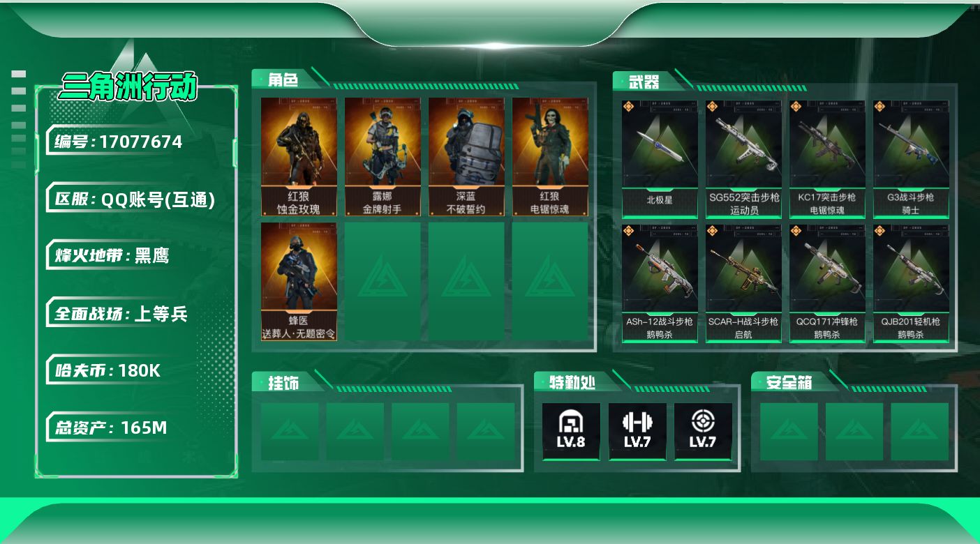[17077674]【店主推荐捡漏号】165m总资产-180k哈伏币-60烽火等级-黑鹰-23战场等级-上等兵 【干员外观】:红狼-蚀金玫瑰,蜂医-送葬人·无题密令,深蓝-不破誓约,红狼-电锯惊魂,露娜-金牌射手 【近战皮肤】:近战-北极星,近战-黑鹰 【传说外观】:M4A1突击步枪-蚀金玫瑰,M4A1突击步枪-阿米娅,ASh-12战斗步枪-鹅鸭杀,SG552突击步枪-运动员,AK-12突击步枪-特斯拉线圈,SCAR-H战斗步枪-启航,G3战斗步枪-骑士,CAR-15突击步枪-阿米娅,腾龙突击步枪-捞点薯条,K437突击步枪-北极星,KC17突击步枪-电锯惊魂,UZI冲锋枪-特斯拉线圈,SR-3M紧凑突击步枪-特斯拉线圈,勇士冲锋枪-能天使-午夜邮差,QCQ171冲锋枪-北极星,QCQ171冲锋枪-鹅鸭杀,725双管霰弹枪-送葬人-无题密令,M250通用机枪-骑士之心,QJB201轻机枪-鹅鸭杀,AWM狙击步枪-捞点薯条,93R-捞点薯条,复合弓-黑·天际线 【史诗外观】:QBZ95-1突击步枪-曙光,ASh-12战斗步枪-无极限,M16A4突击步枪-竞赛选手,AUG突击步枪-蝮蛇,M7战斗步枪-百步穿杨,SG552突击步枪-深海恐惧,SCAR-H战斗步枪-囚徒,G3战斗步枪-流沙送葬,AS Val突击步枪-百步穿杨,腾龙突击步枪-无垢,腾龙突击步枪-猎鳄行动,K437突击步枪-守护者,MP5冲锋枪-深海恐惧,MP5冲锋枪-战术竞备,MP5冲锋枪-竞技风,Vector冲锋枪-阿萨拉文明,Vector冲锋枪-猎鳄行动,Vector冲锋枪-百步穿杨,Vector冲锋枪-异域战争,SR-3M紧凑突击步枪-荒野求生,SR-3M紧凑突击步枪-战术竞备,勇士冲锋枪-深海恐惧,勇士冲锋枪-工业狂潮,MP7冲锋枪-无垢,MP7冲锋枪-守护者,S12K霰弹枪-曙光,PKM通用机枪-蝮蛇,PKM通用机枪-荒野求生,M250通用机枪-囚徒,Mini-14射手步枪-守护者,SVD狙击步枪-阿萨拉工艺,SVD狙击步枪-荒野求生,PSG-1射手步枪-无垢,SV-98狙击步枪-林中猎手,SV-98狙击步枪-囚徒,M700狙击步枪-竞技风,M700狙击步枪-蝮蛇,M700狙击步枪-百步穿杨,M700狙击步枪-哈夫克警备,AWM狙击步枪-无极限,AWM狙击步枪-流沙送葬,复合弓-守护者 【稀有外观】:M1014霰弹枪