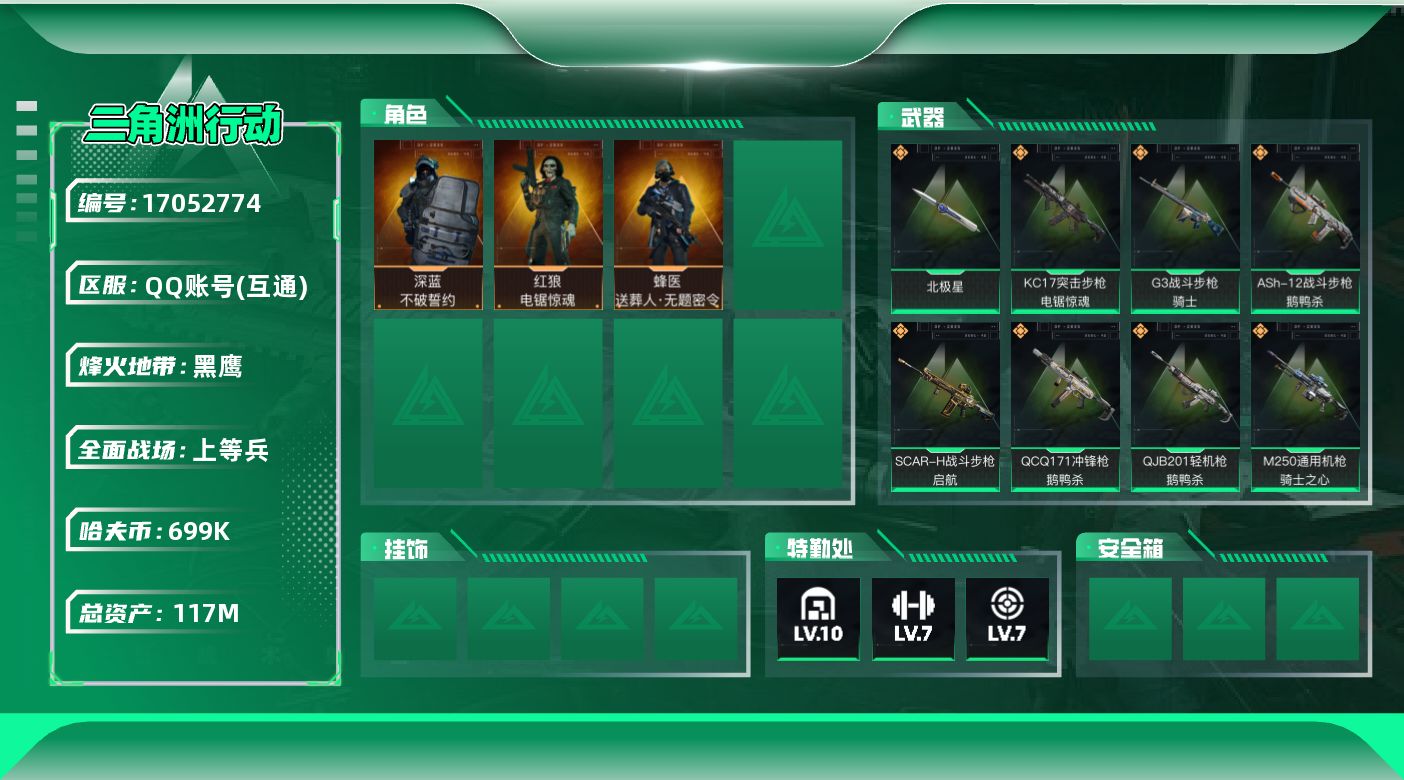 [17052774]【店主推荐捡漏号!可直接换绑】117m总资产-699k哈伏币-60烽火等级-黑鹰-34战场等级-上等兵 【干员外观】:蜂医-送葬人·无题密令,深蓝-不破誓约,红狼-电锯惊魂 【近战皮肤】:近战-北极星,近战-黑鹰 【传说外观】:M4A1突击步枪-阿米娅,ASh-12战斗步枪-鹅鸭杀,AK-12突击步枪-特斯拉线圈,SCAR-H战斗步枪-启航,G3战斗步枪-骑士,CAR-15突击步枪-阿米娅,腾龙突击步枪-捞点薯条,K437突击步枪-北极星,KC17突击步枪-电锯惊魂,UZI冲锋枪-特斯拉线圈,SR-3M紧凑突击步枪-特斯拉线圈,勇士冲锋枪-能天使-午夜邮差,QCQ171冲锋枪-北极星,QCQ171冲锋枪-鹅鸭杀,725双管霰弹枪-送葬人-无题密令,M250通用机枪-骑士之心,QJB201轻机枪-鹅鸭杀,AWM狙击步枪-捞点薯条,93R-捞点薯条,复合弓-黑·天际线 【史诗外观】:AKM突击步枪-林中猎手,ASh-12战斗步枪-无极限,M16A4突击步枪-竞赛选手,AUG突击步枪-蝮蛇,AS Val突击步枪-典狱官,腾龙突击步枪-无垢,腾龙突击步枪-猎鳄行动,K437突击步枪-守护者,MP5冲锋枪-战术竞备,MP5冲锋枪-竞技风,Vector冲锋枪-猎鳄行动,SR-3M紧凑突击步枪-荒野求生,SR-3M紧凑突击步枪-战术竞备,勇士冲锋枪-工业狂潮,MP7冲锋枪-无垢,MP7冲锋枪-守护者,M1014霰弹枪-林中猎手,PKM通用机枪-蝮蛇,PKM通用机枪-荒野求生,M250通用机枪-囚徒,Mini-14射手步枪-守护者,SVD狙击步枪-阿萨拉工艺,SVD狙击步枪-暗夜猎手,SVD狙击步枪-荒野求生,PSG-1射手步枪-无垢,SV-98狙击步枪-林中猎手,SV-98狙击步枪-囚徒,M700狙击步枪-竞技风,M700狙击步枪-蝮蛇,M700狙击步枪-哈夫克警备,AWM狙击步枪-无极限,沙漠之鹰-曙光,复合弓-守护者 【稀有外观】:M14射手步枪-花岗岩,M14射手步枪-天际线,AKM突击步枪-战术演练,AKM突击步枪-肃杀,QBZ95-1突击步枪-公平竞技,K416突击步枪-虎啸,AUG突击步枪-指挥官,M7战斗步枪-前沿科技,M7战斗步枪-捣蛋鬼,SCAR-H战斗步枪-童趣,SCAR-H战斗步枪-荣耀列队,SCAR-H战斗步枪-黄昏,G3战斗步枪-战术演练,G3战斗步