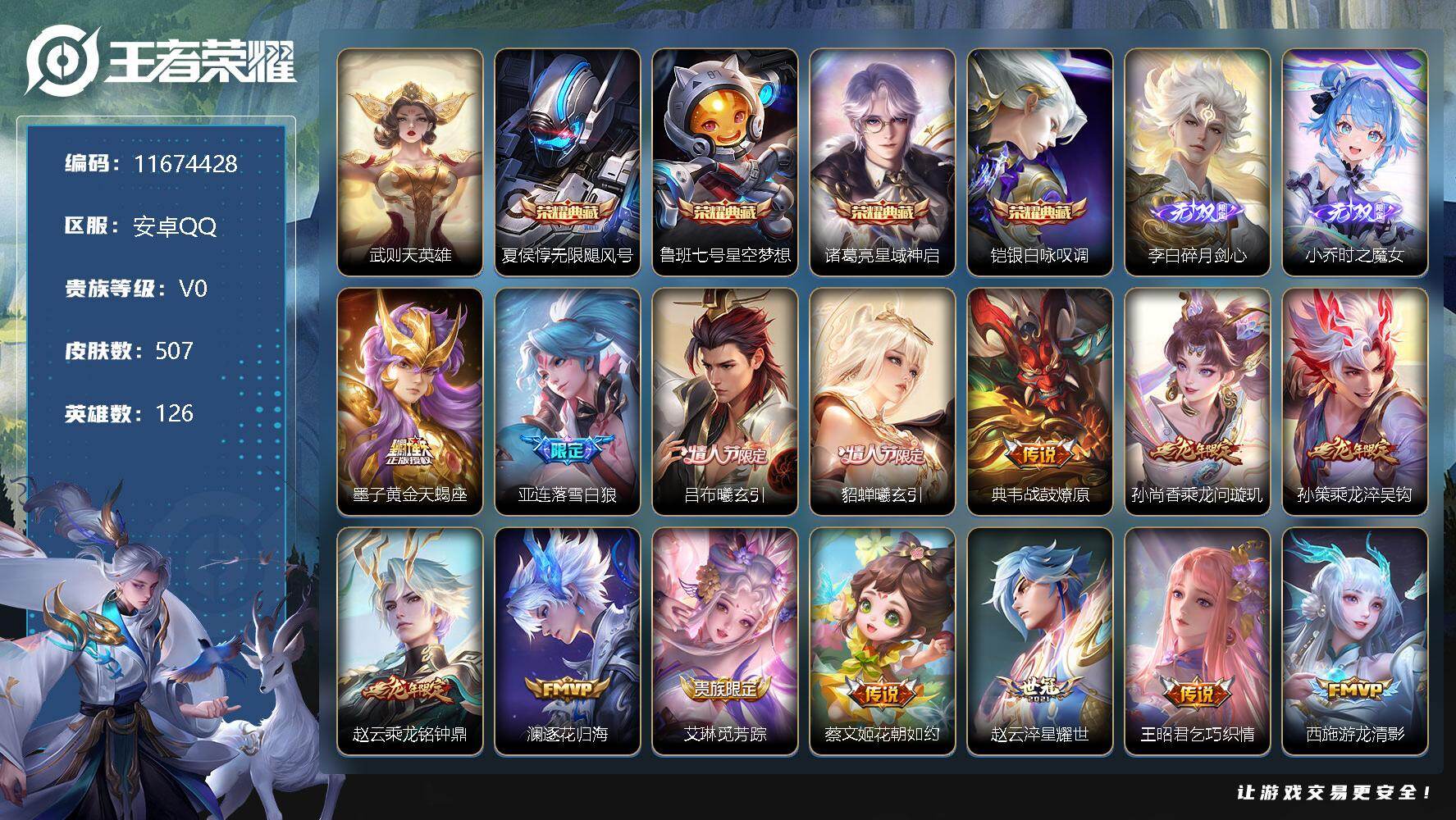 - [12144843]V7 1典藏 1珍品传说 10传说 126英雄 324皮肤 可修改实名 优质装备:天鹅之梦(小乔典藏),大耳狗之梦,冠军飞将,绛天战甲(鸡嘴战神),猫影幻舞,炽阳神光,妄想实况,涂山容容 传说皮:幻光神枪 珍宝阁皮:妄想食味,优雅恋人,蔷薇恋人 限定皮:愿照·九州拓(澜年限),愿照·岁时盈(虞姬年限),逐霄战戟,鸣野蒿,至尊宝,齐天大圣,五谷丰年,梁祝,李小龙 史诗皮:赞萌露比,鸭鸭历险记-刘禅,狼魂孤将,化蝶舞,龙之律动,琥珀纪元伽罗,星界战将,百相守梦-周瑜,茶境仙,百相守梦-黄忠,蒙犽顽岩魄,海诺心动手记,蔬乡物语(鲁班七号),幻珠鲛人,守夜人,织梦人,黄金分割率,特工魅影,千年之狐,江河有灵,青蛇,百解令(蒙犽),高渐离燃音魔法,蒙恬荣光圣徽,魅语,电玩·爆裂旋风,偶像歌手,暗夜猫娘,末日机甲-吕布,猫狗日记-孙策,猫狗日记-大乔,节奏热浪,修罗,女仆咖啡,摇滚巨星,水果甜心,天才门将,心灵骇客,功夫厨神,德古拉伯爵,暗隐猎兽者,鬼剑武藏,心灵战警,舞动绿茵,地狱岩魂,纤云弄巧,繁星吟游(呼啦呼啦),拒霜思,逐浪之夏,水晶猎龙者,曙光守护者,金属风暴,原初追逐者,圣诞狂欢,圣诞恋歌,鹰眼统帅,暗夜贵公子,魅力维加斯,黎明之约,无心,未来纪元-赵云
