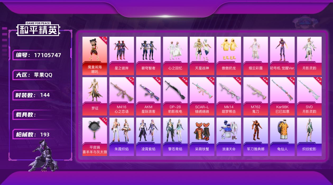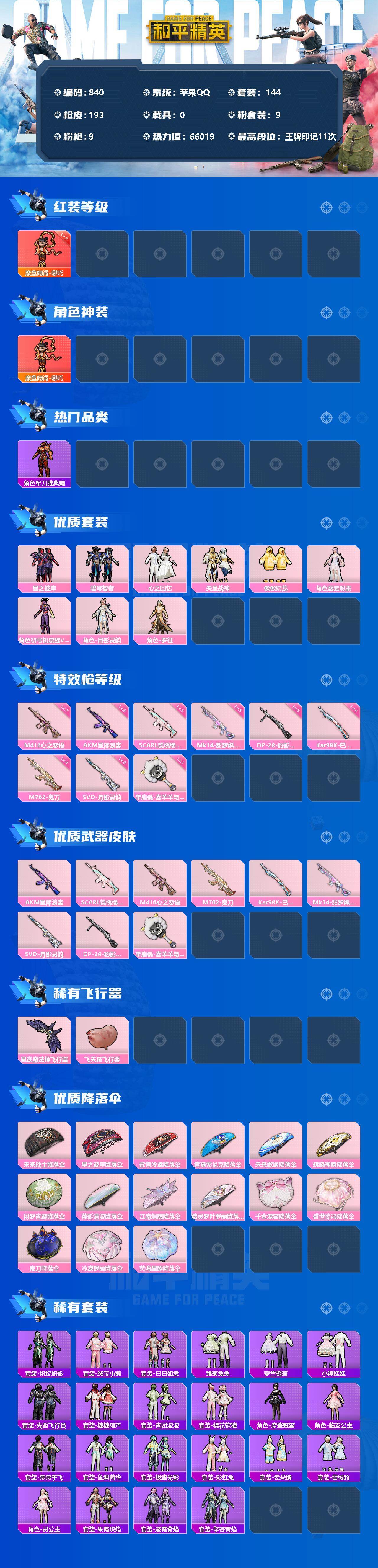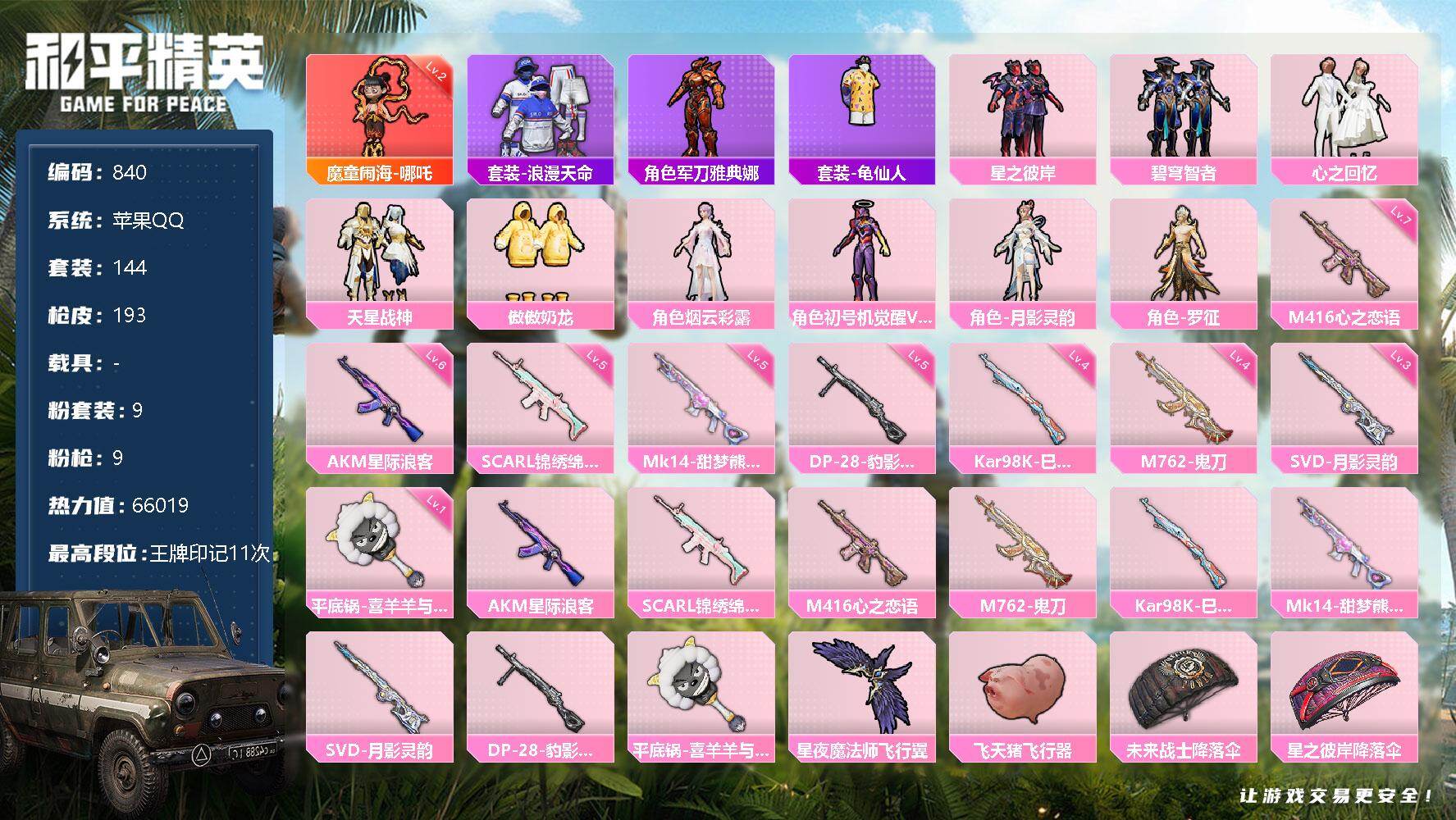 [17105747]【840】苹果 手Q-1神装-9粉装-9特效枪-0载具-3粉色飞行器-66019热力值-11王牌印记-144套装-193枪皮