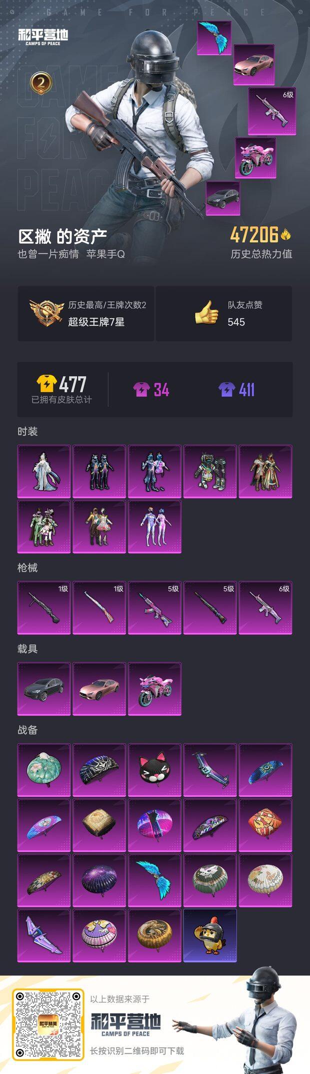 [17105747]【840】苹果 手Q-1神装-9粉装-9特效枪-0载具-3粉色飞行器-66019热力值-11王牌印记-144套装-193枪皮 【红色神装等级】:魔童闹海-哪吒(二级) 【红色角色神装】:魔童闹海-哪吒 【热门品类】:套装-浪漫天命,角色-军刀雅典娜,套装-龟仙人 【粉色套装】:粉装-星之彼岸,粉装-碧穹智者,粉装-心之回忆,粉装-天星战神,粉装-傲傲奶龙,角色-烟云彩露,角色-初号机 觉醒Ver.,角色-月影灵韵,角色-罗征 【粉色枪皮等级】:AKM-星际浪客(六级),SCAR-L-锦绣绵绵(五级),M416-心之恋语(七级),M762-鬼刀(四级),Kar98K-巳巳如意(四级),Mk14-甜梦熊击(五级),SVD-月影灵韵(三级),DP-28-豹影疾电(五级),平底锅-喜羊羊与灰太狼(一级) 【粉色枪皮】:AKM-星际浪客,SCAR-L-锦绣绵绵,M416-心之恋语,M762-鬼刀,Kar98K-巳巳如意,Mk14-甜梦熊击,SVD-月影灵韵,DP-28-豹影疾电,平底锅-喜羊羊与灰太狼 【粉色飞行器】:星夜魔法师飞行翼,飞天猪飞行器 【粉色降落伞】:未来战士降落伞,星之彼岸降落伞,歌者泠鸢降落伞,音爆索尼克降落伞,未来歌姬降落伞,拂晓神骑降落伞,闲梦青缨降落伞,莲影清波降落伞,江南烟雨降落伞,精灵梦叶罗丽降落伞,千金淑猫降落伞,盛世惊鸿降落伞,鬼刀降落伞,冷漠罗丽降落伞,荧海星豚降落伞 【稀有套装】:套装-龟仙人,套装-炽纹蛇影,套装-绒宝小鹅,套装-巳巳如意,套装-雏菊兔兔,套装-萝兰蝴蝶,套装-小熊娃娃,套装-先驱飞行员,套装-糖糖葫芦,套装-青团波波,套装-棉花软糖,角色-摩登魅猫,角色-临安公主,套装-燕燕于飞,套装-鱼渊荷华,套装-极速光影,套装-彩虹兔,套装-云朵鹅,套装-雪绒豹,角色-灵公主,套装-朱霞炽焰,套装-凌霄紫焰,套装-擎苍青焰 【稀有枪皮】:AKM-墨染幽兰,AKM-江南烟雨,AKM-灼热熔岩,AKM-王牌投手,AKM-环太平洋,AKM-龙的传人,M16A4-幻世战舞者,M16A4-甜心亚梦,M16A4-莲影清波,M16A4-千金淑猫,SCAR-L-炫彩节奏,SCAR-L-玉兔迎春,SCAR-L-红色方程式,SCAR-L-黄金龙骨,M416-糯团青竹,M416-红色方程式,GROZA-影袭,GROZA-田园牧歌,GROZA-荧海星豚