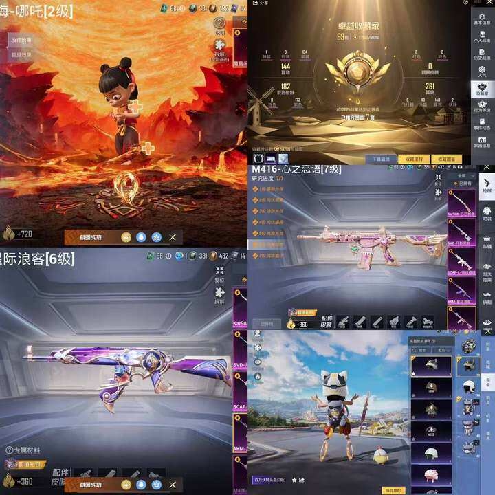 【粉色枪皮等级】:AKM-星际浪客(六级),SCAR-L-锦绣绵绵(五级),M416-心之恋语(七级),M762-鬼刀(四级),Kar98K-巳巳如意(四级),Mk14-甜梦熊击(五级),SVD-月影灵韵(三级),DP-28-豹影疾电(五级),平底锅-喜羊羊与灰太狼(一级)